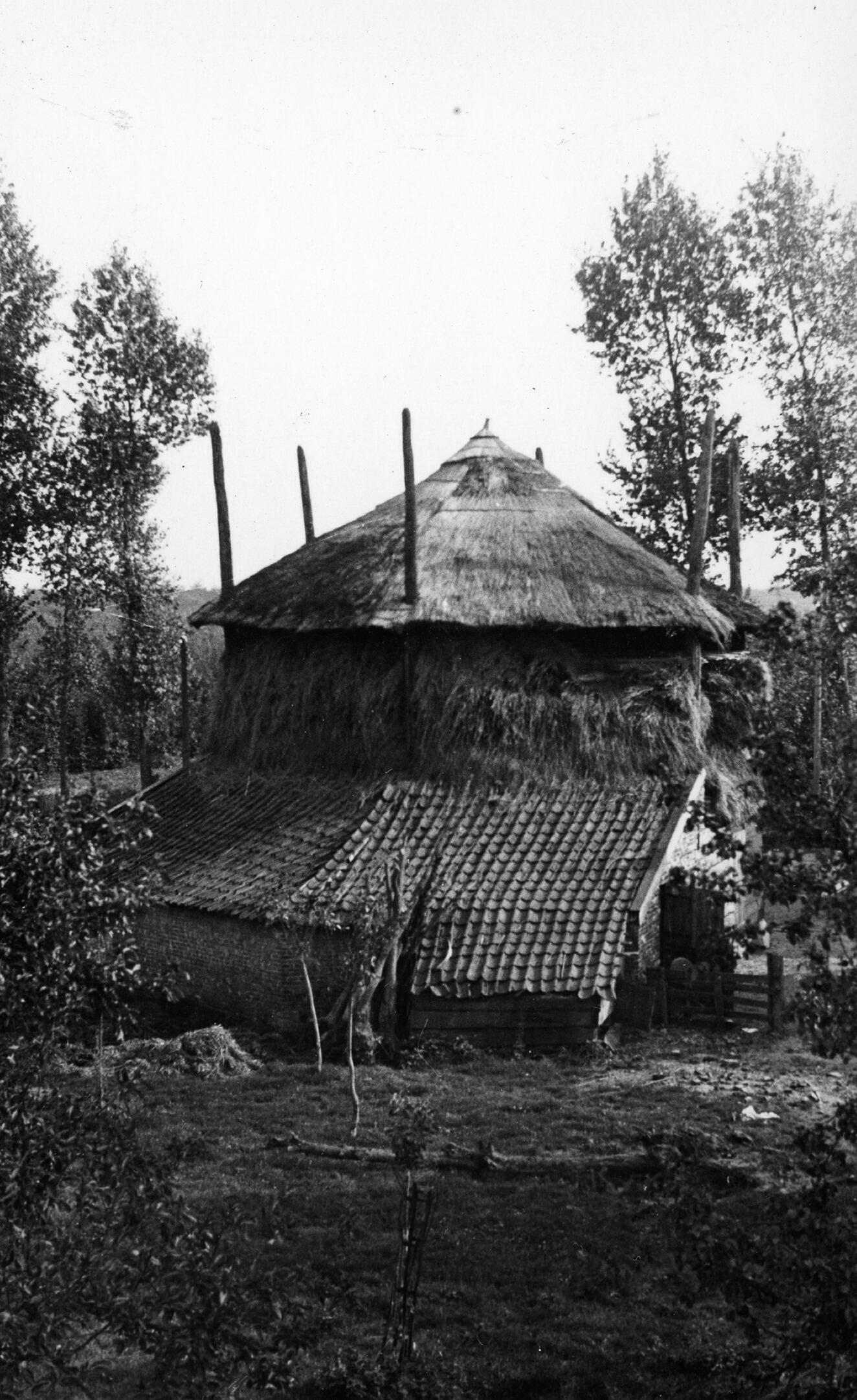 Boerenerf met hooibergen, Rhenen, 1936 (zwart-wit foto)