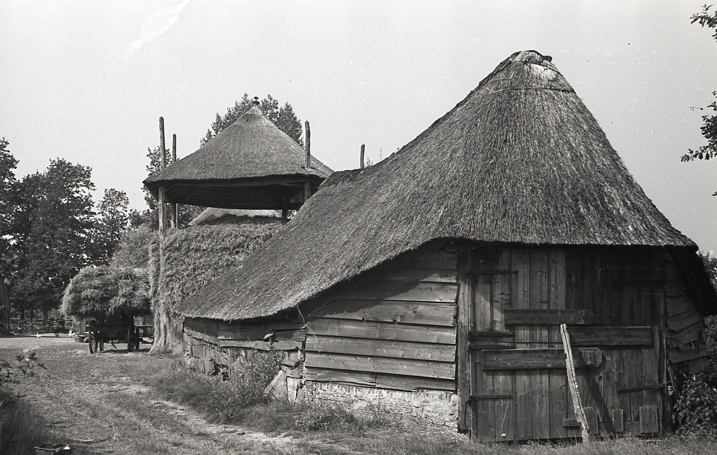 Boerderij met hooibergen, Hoekelum, 1940 (zwart-wit ...