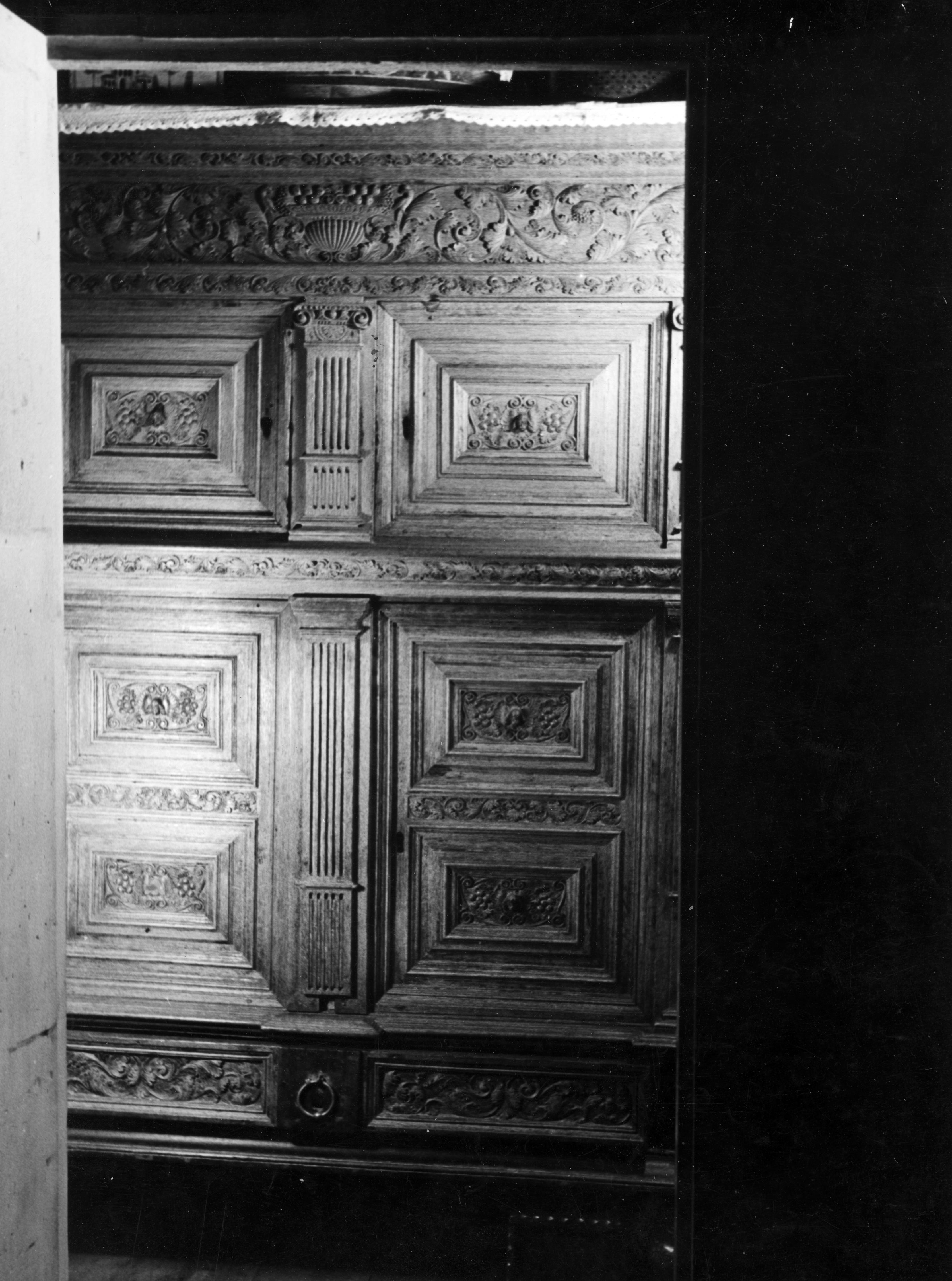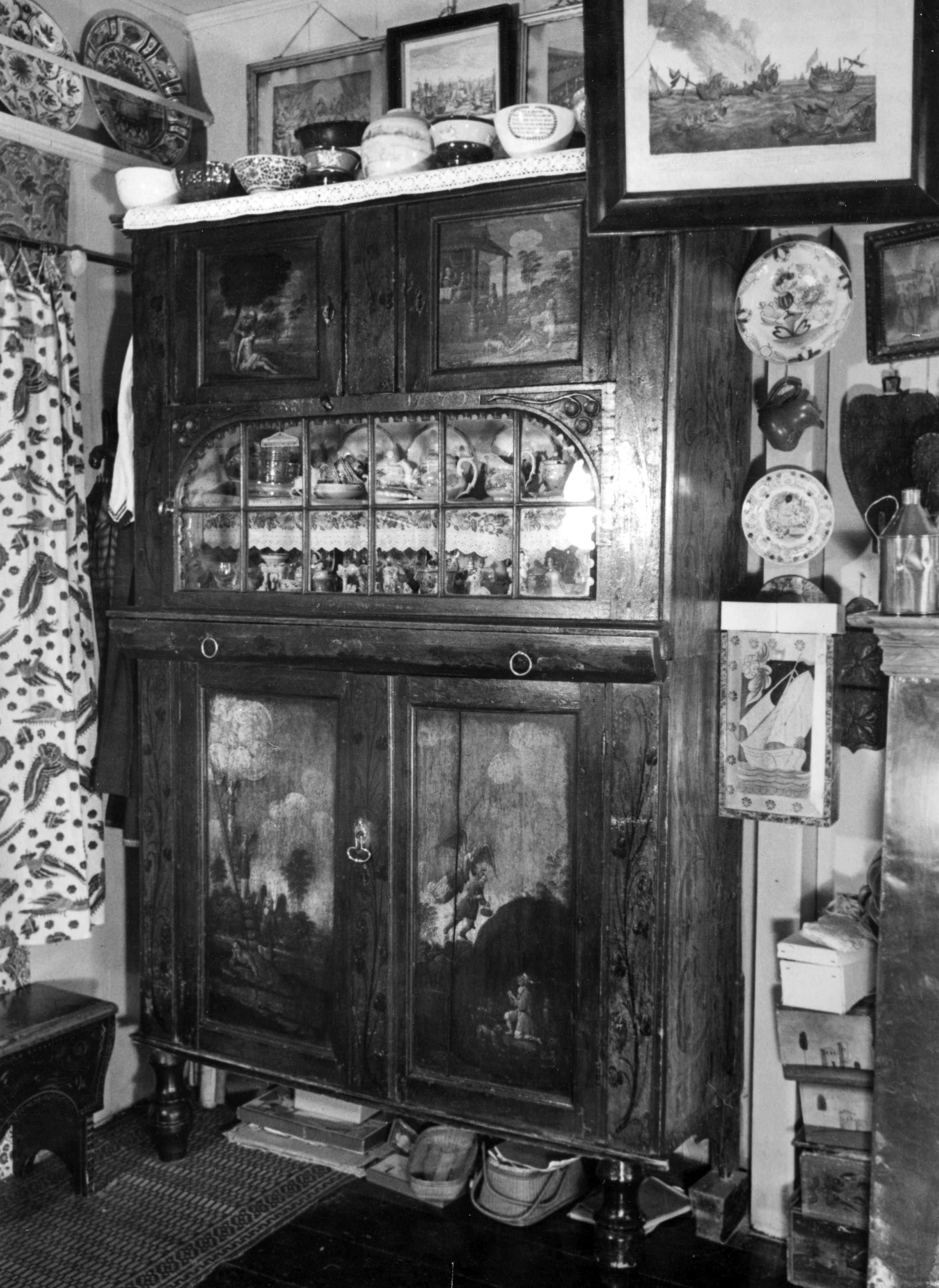 Besneden houten kast, Marken, 1943 (zwart-wit foto)