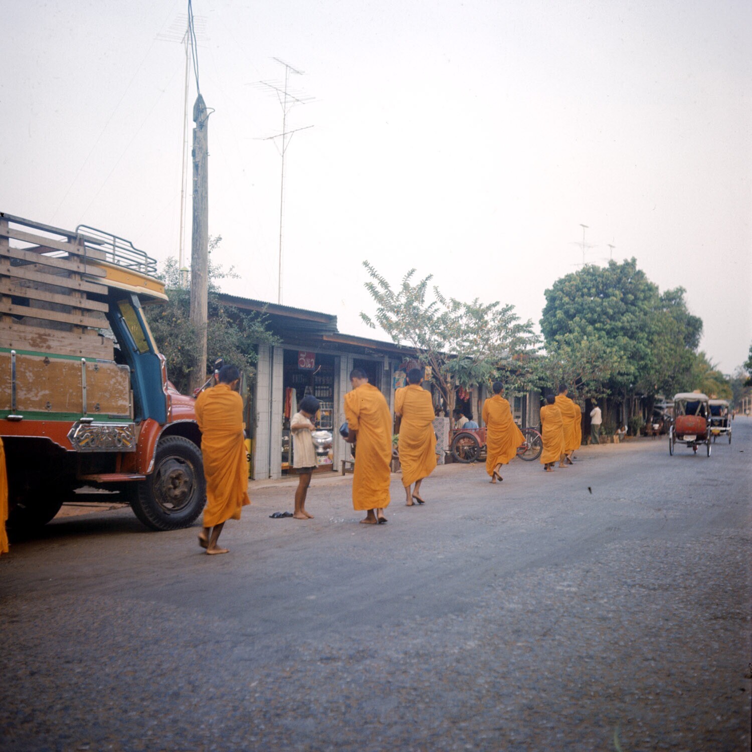 Monniken ontvangen hun voedselaalmoes in de morgen