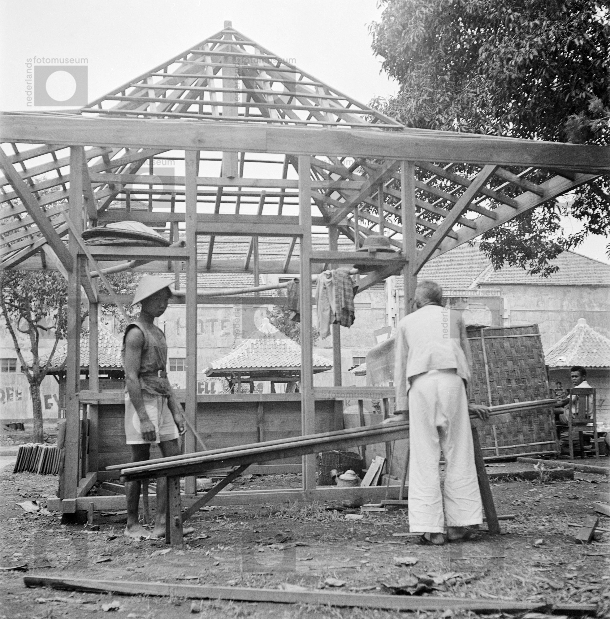 Twee mannen bouwen het houtskelet van een inheems ge...