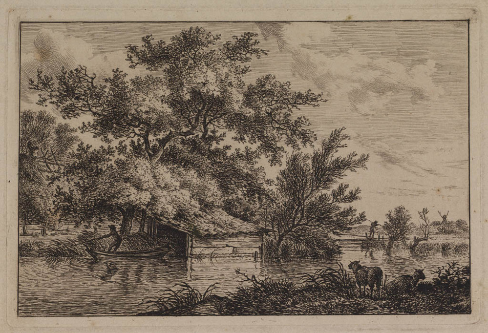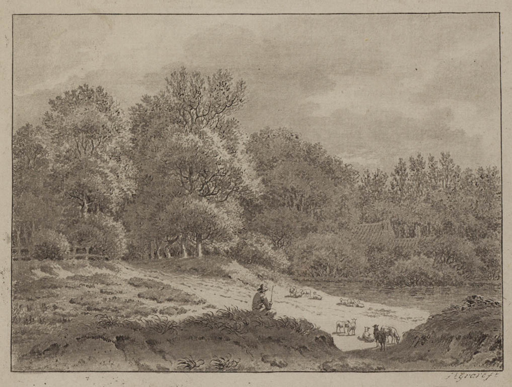 Herder met schapen bij een ven