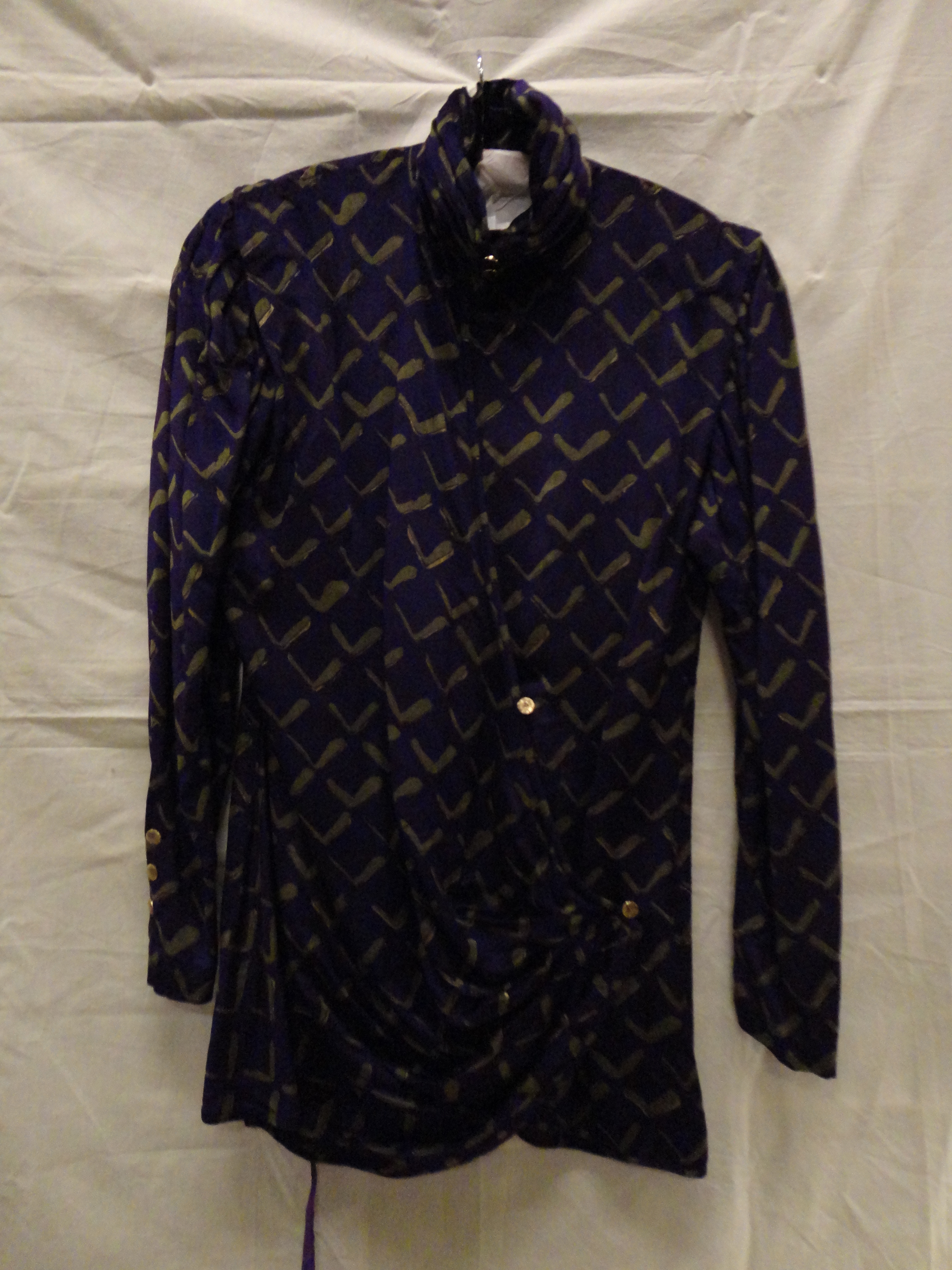 Blouse van paars fluweel bedrukt met V-vormig motief...