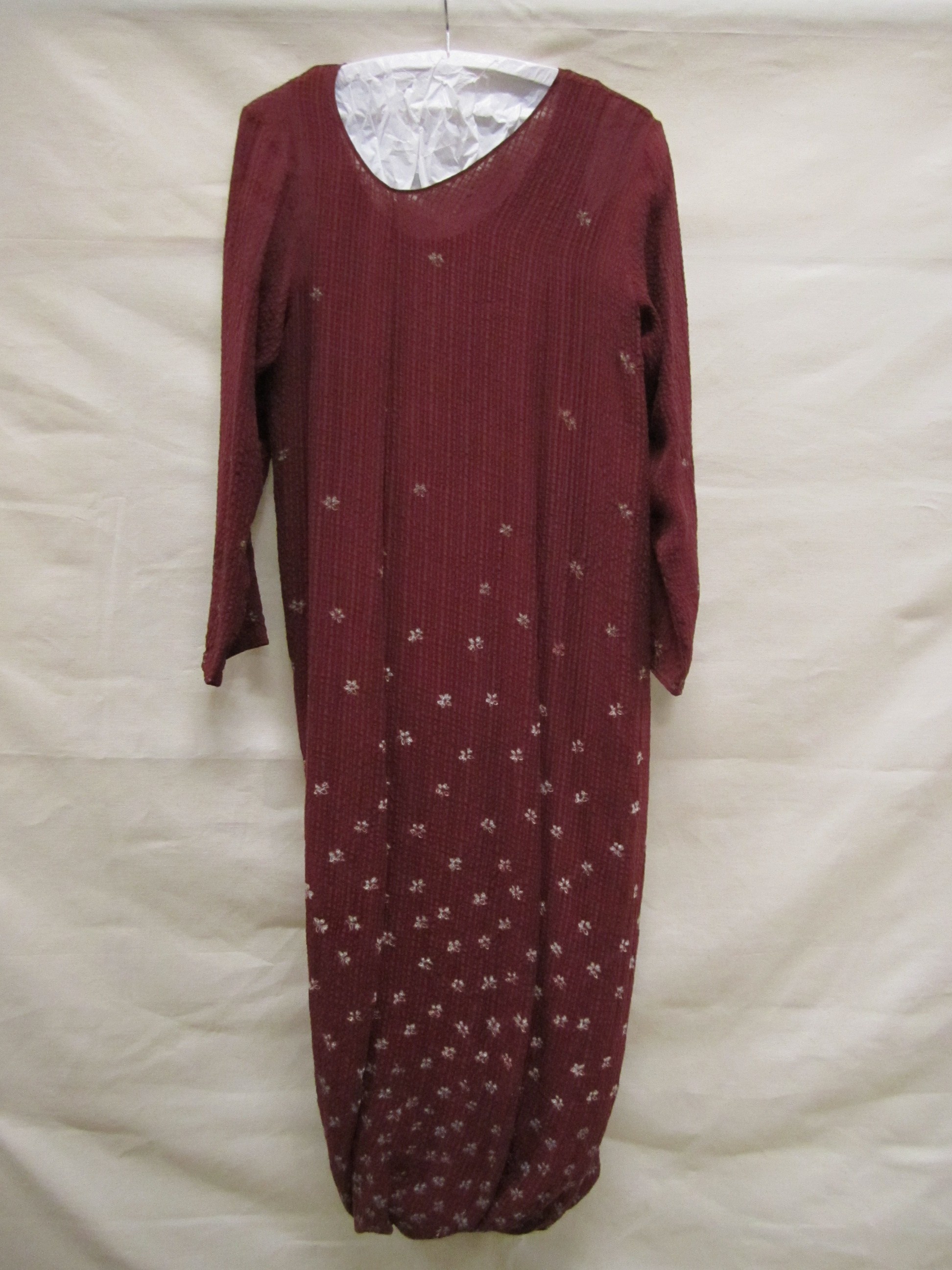Jurk van donkerrode zijde, deels geweven in ruitpatr...