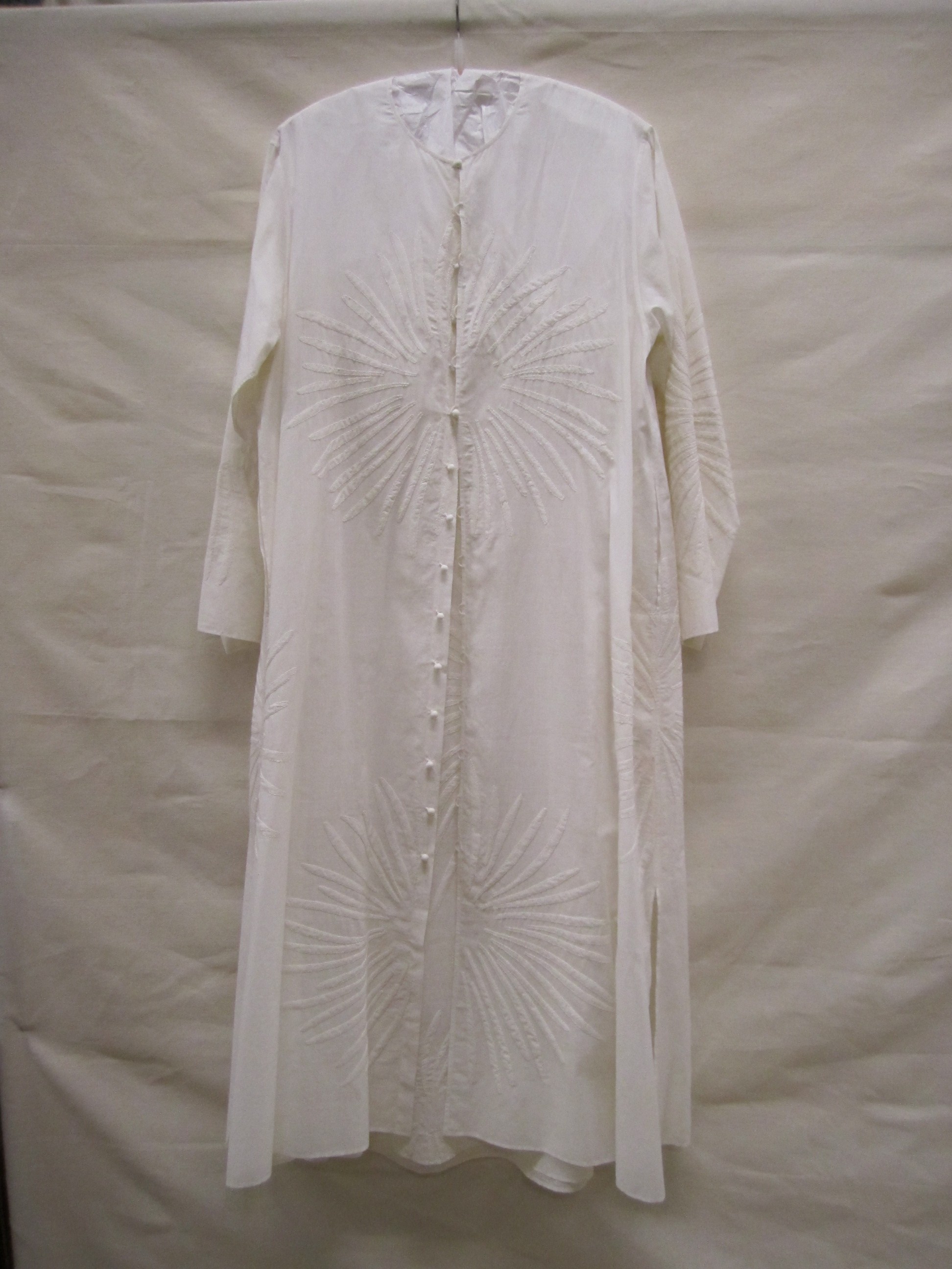 Jurk en overjurk van wit katoen, handgeborduurd in g...