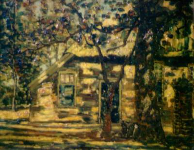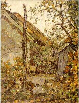 Huisje in boomrijke omgeving, rechts een pomp