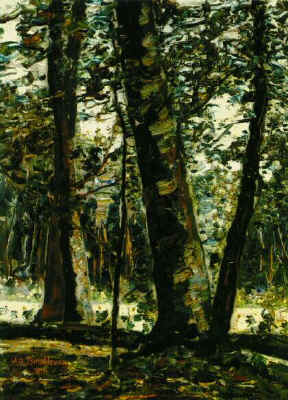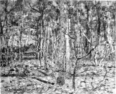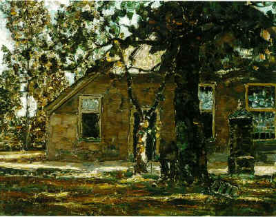 Berkenbosje, links kleine hut met rood dak