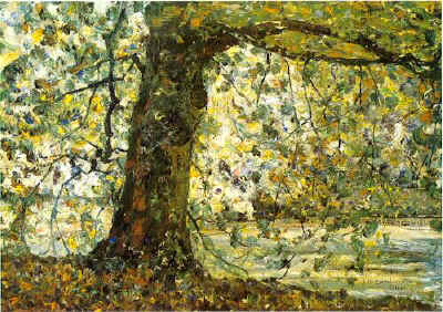 Boom met wijde vertakking, weinig bladeren, veel gee...