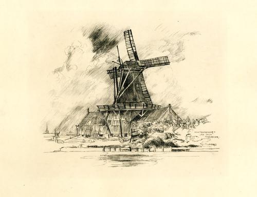 Lithografie van houtzaagmolen 'De Valk' in Franeker ...