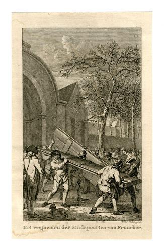 Gravure van het inzetten van de stadspoorten