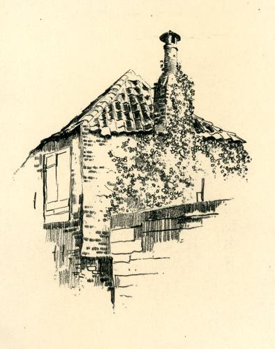 Tekening met potlood van een stenen huisje door Bouk...