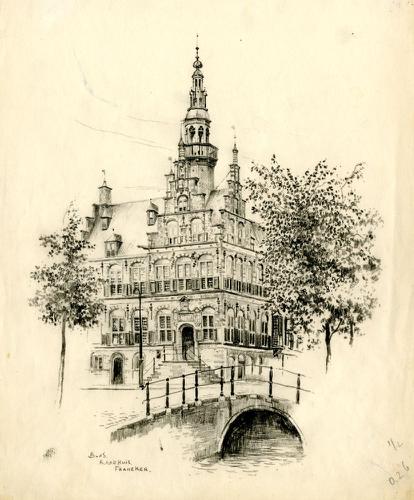 Tekening met potlood van het Raadhuis in Franeker do...