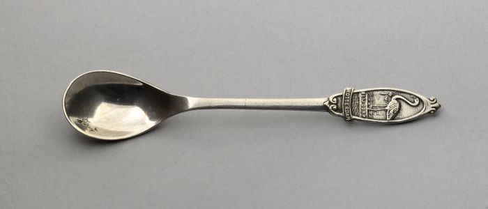 Verzilverd theelepeltje met afbeelding van een stads...