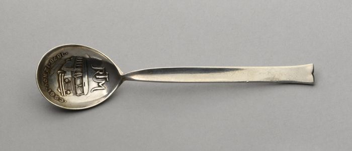 Verzilverd theelepeltje met afbeelding van een stoom...