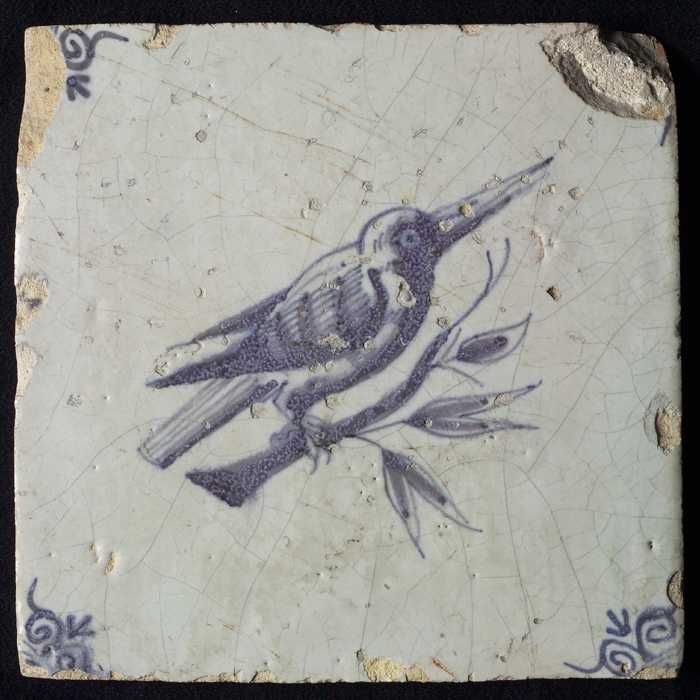 Dierentegel, vogel op tak, hoekmotief ossenkop