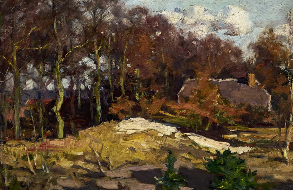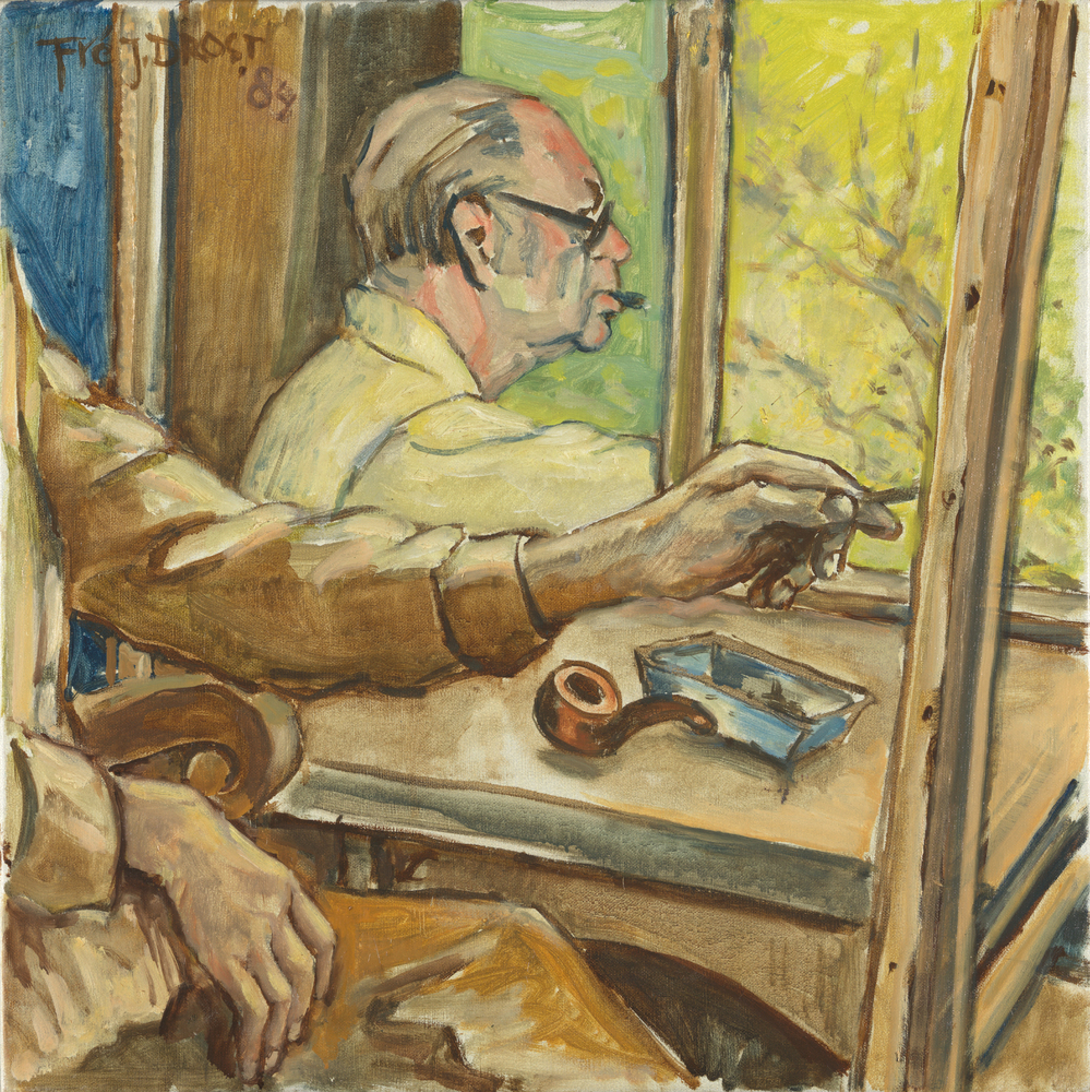 Zelfportret met schildersdoek en pijp