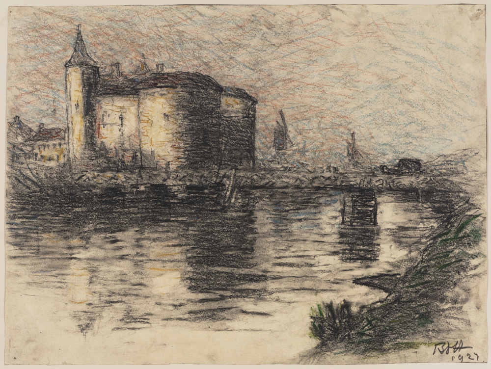 Kasteel aan rivier met molens