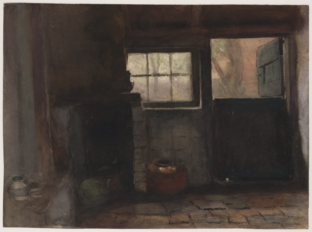 Interieur van een bijkeuken met schouw en openstaand...