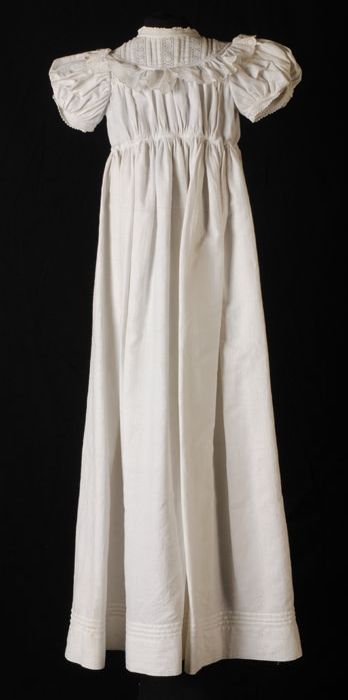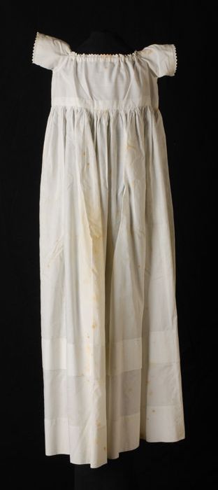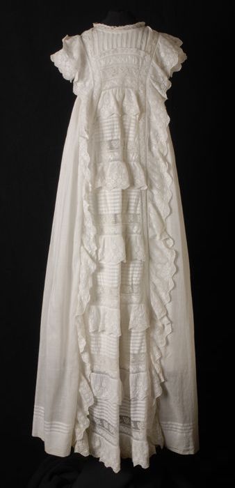 Lange wijduitlopende doopjurk van wit katoen, gerimp...