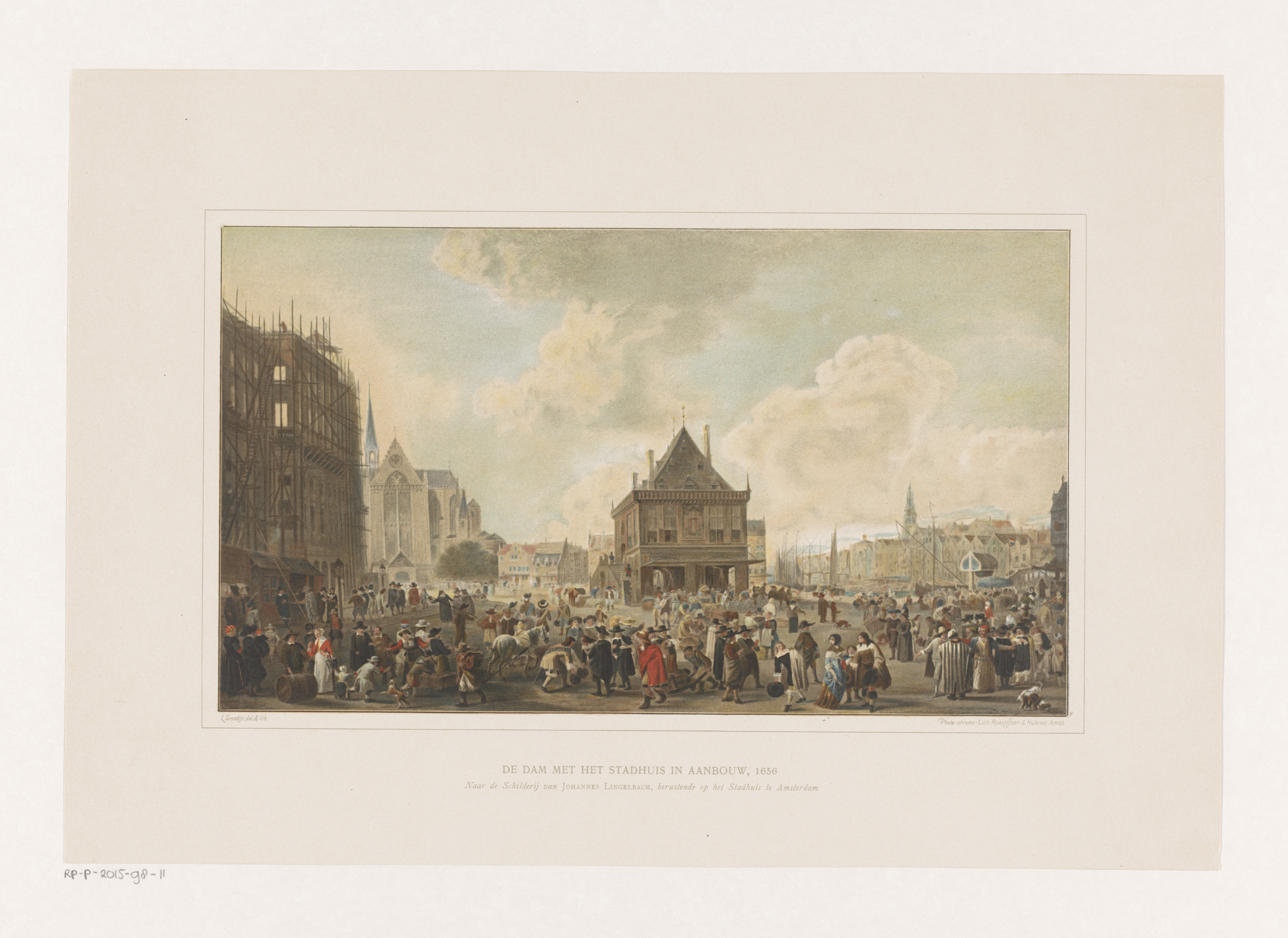 Dam in Amsterdam met het stadhuis in aanbouw