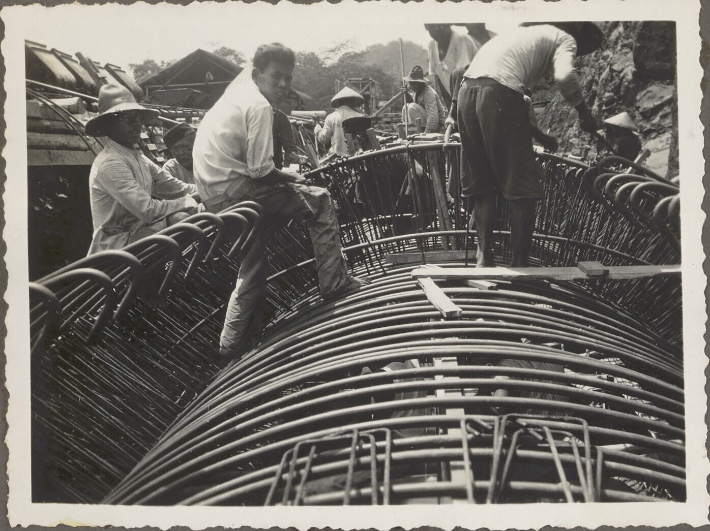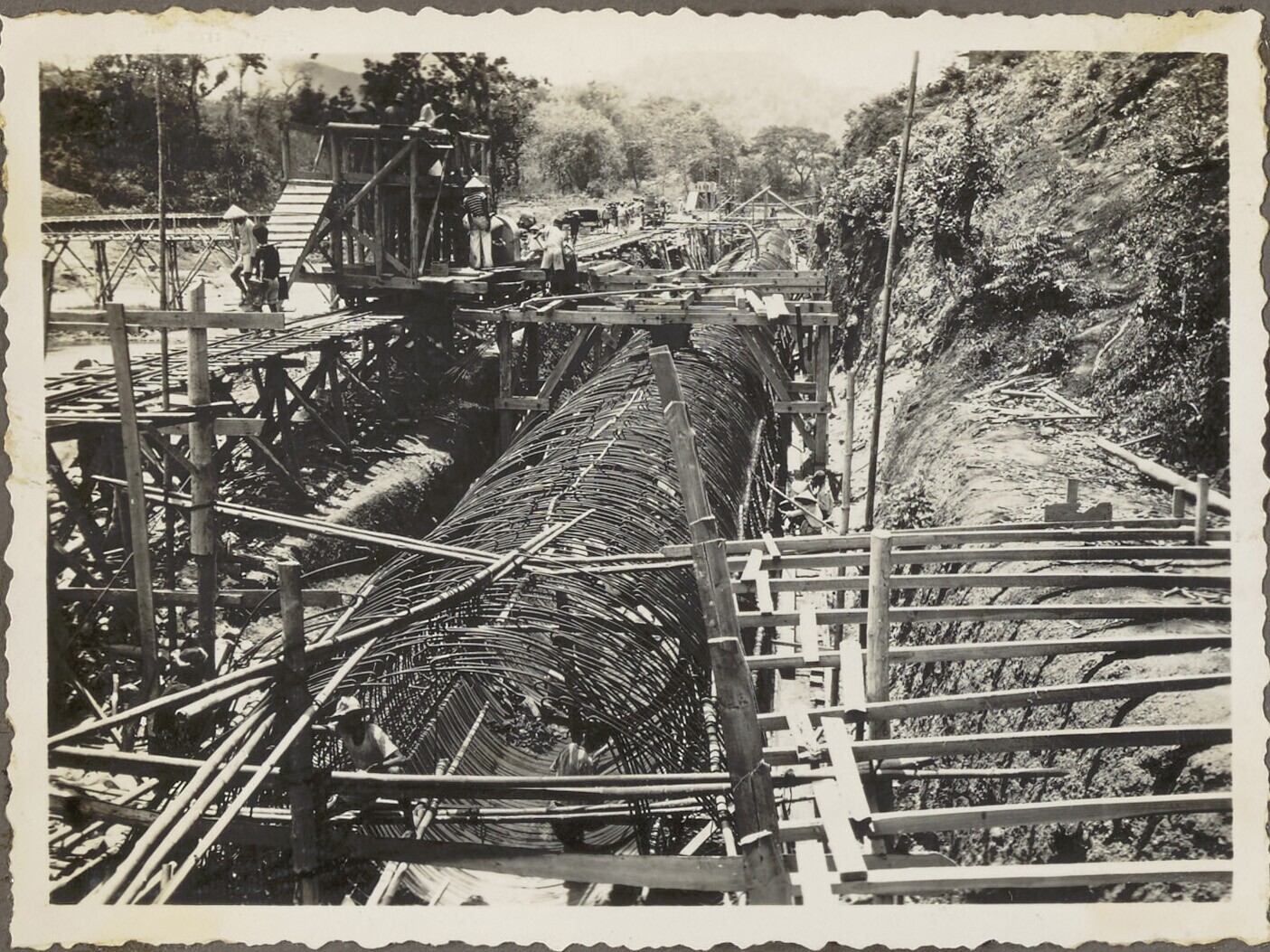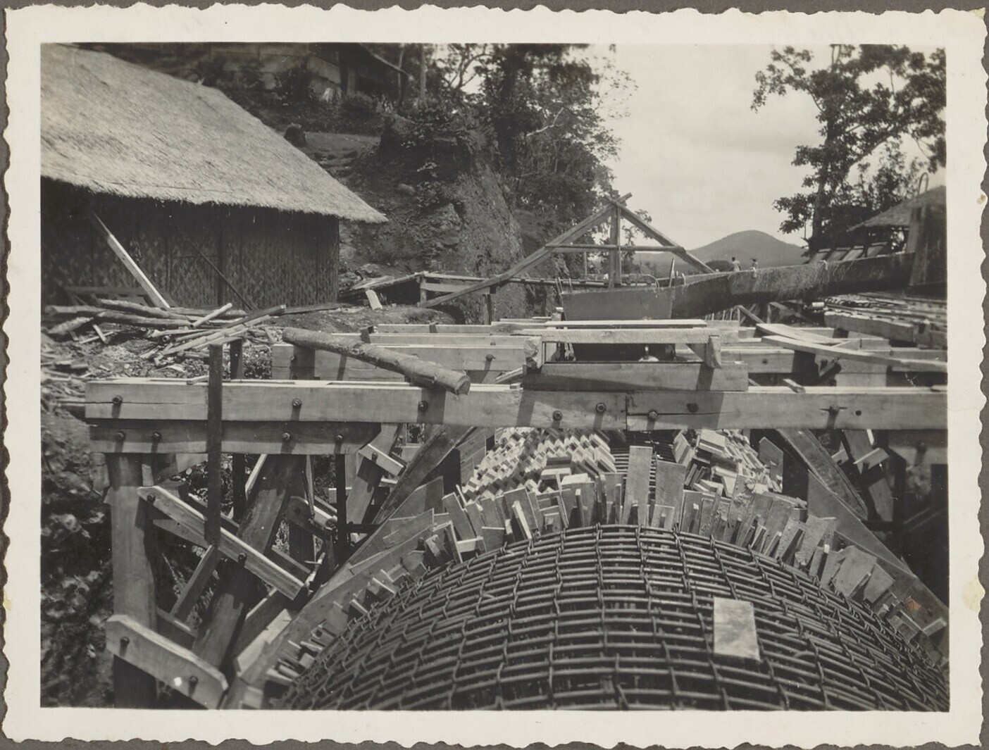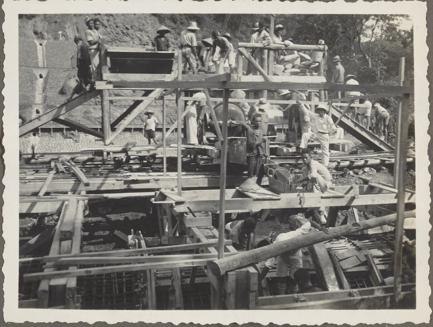 Bouw van een buis met woelbak door Javaanse arbeiders