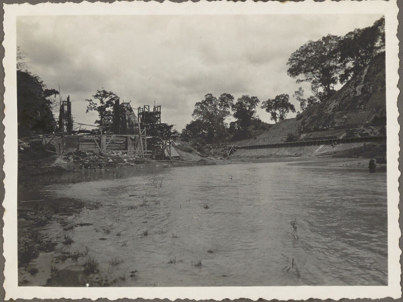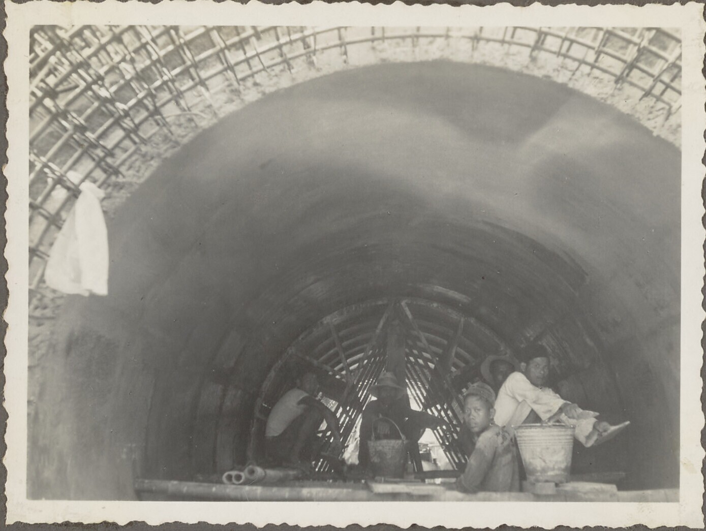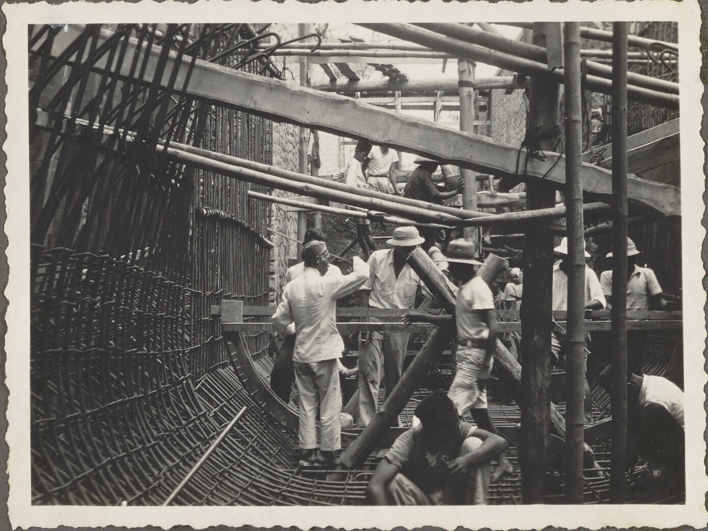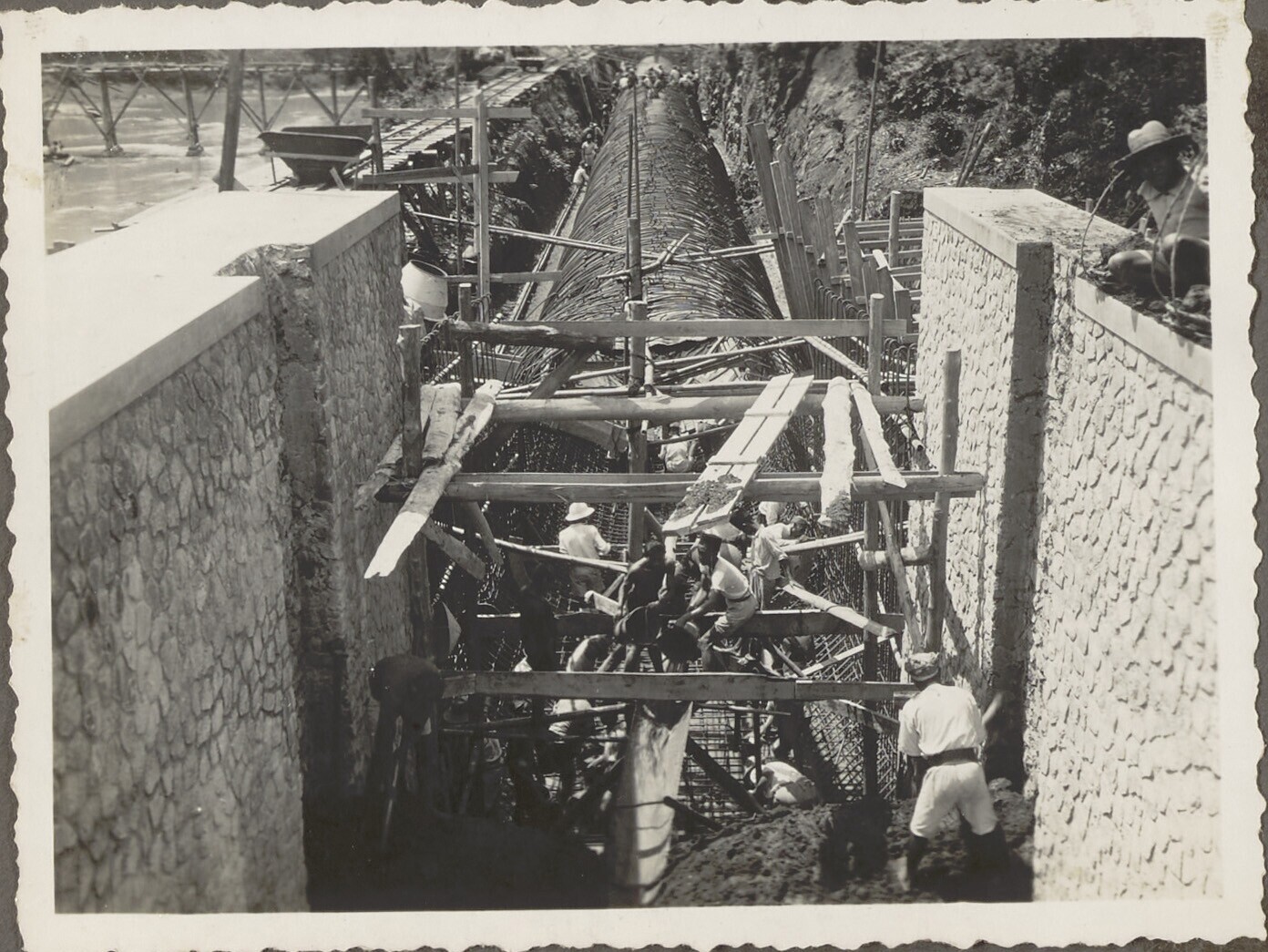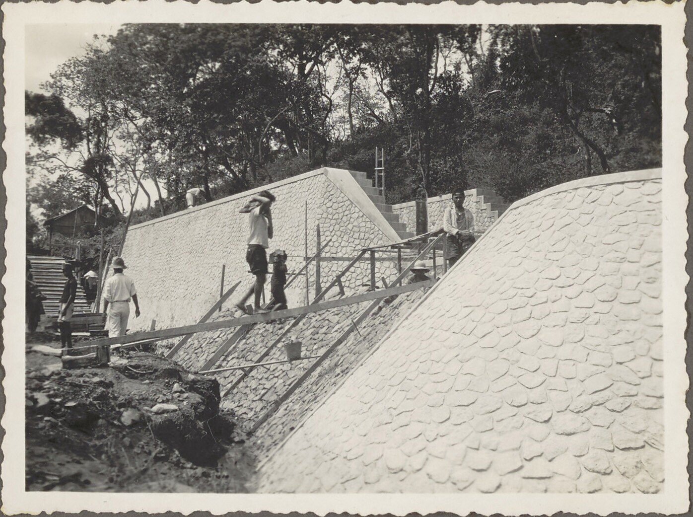 Bouw van een buis met woelbak door Javaanse arbeiders