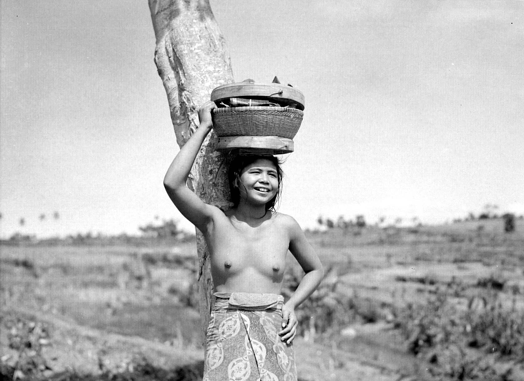 Portret van een Balinese vrouw met mand op het hoofd