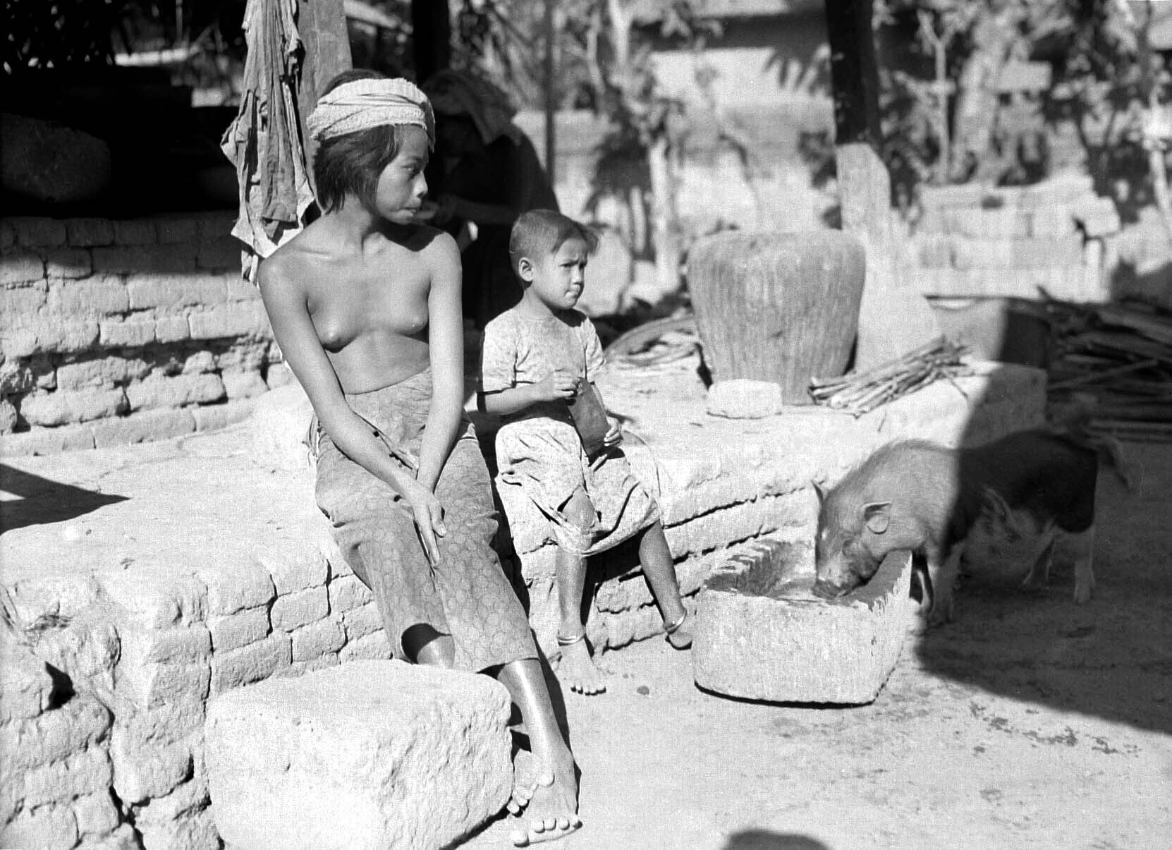 Twee Balinese kinderen en een varken op een erf