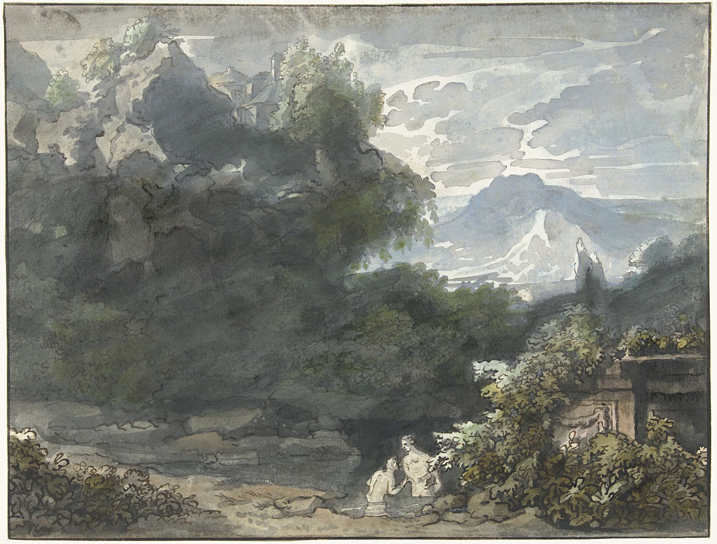 Baders bij antiek monument in bergachtig landschap
