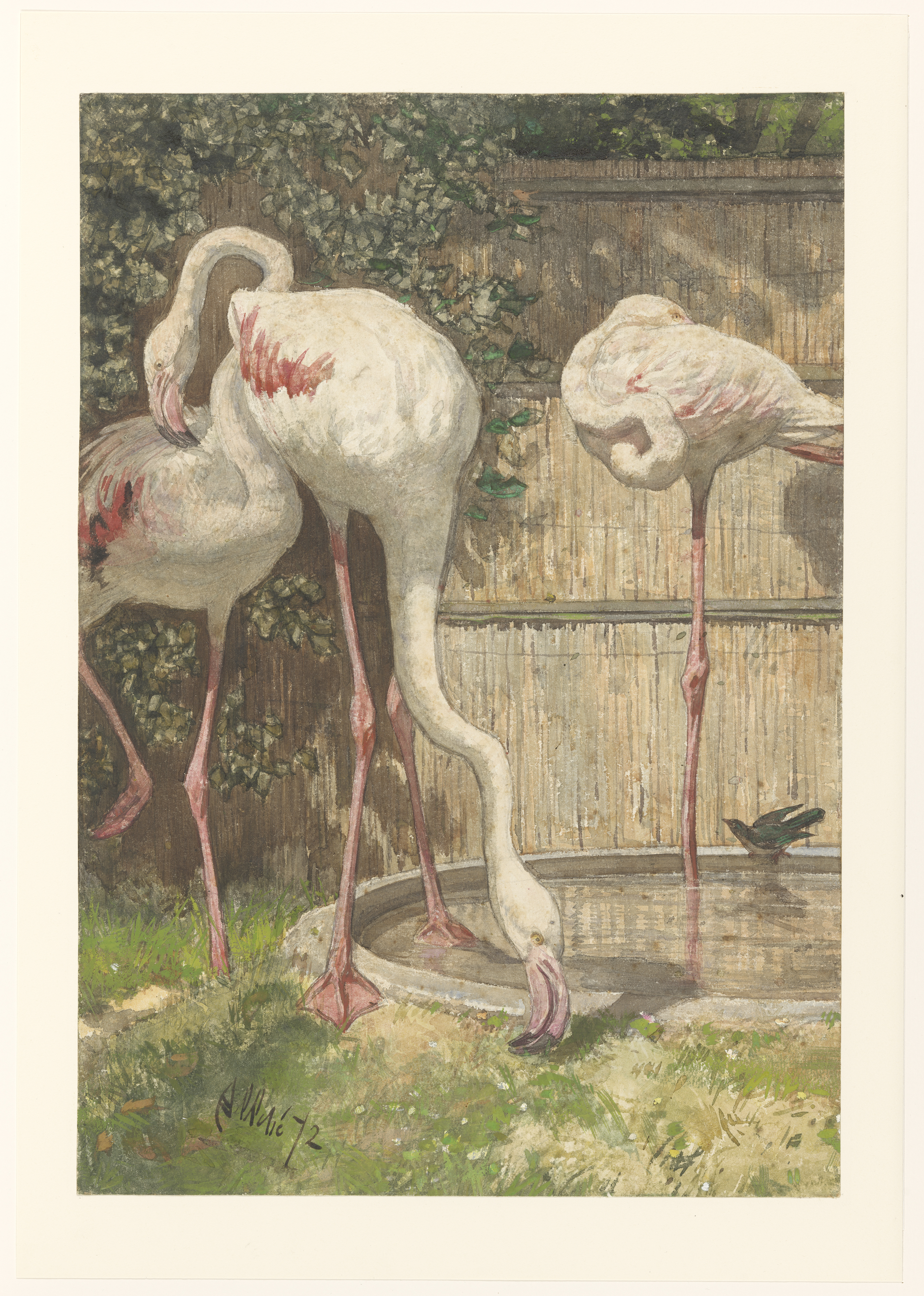 Drie flamingo's bij een bassin