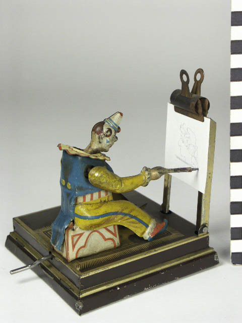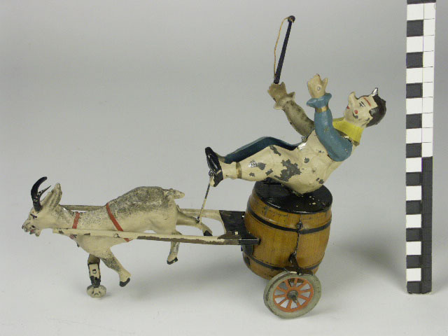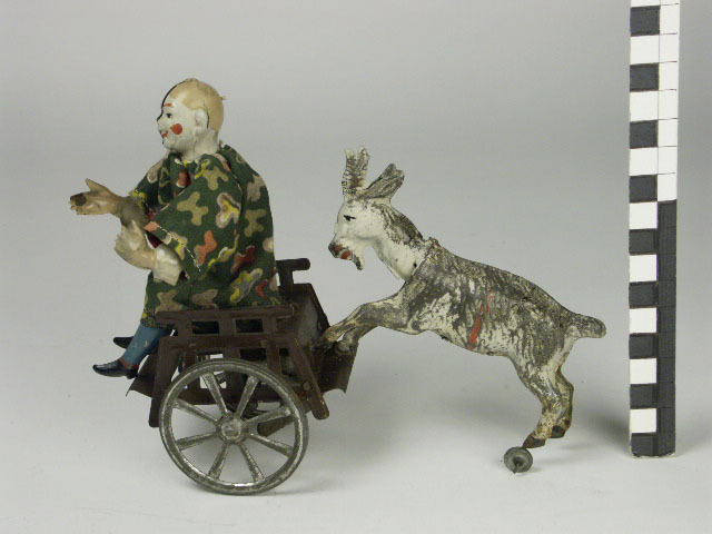 Clown op bokkewagen in de vorm van een ton getrokken...