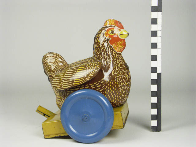 Kip op wielen die d.m.v een stok kan worden voortged...