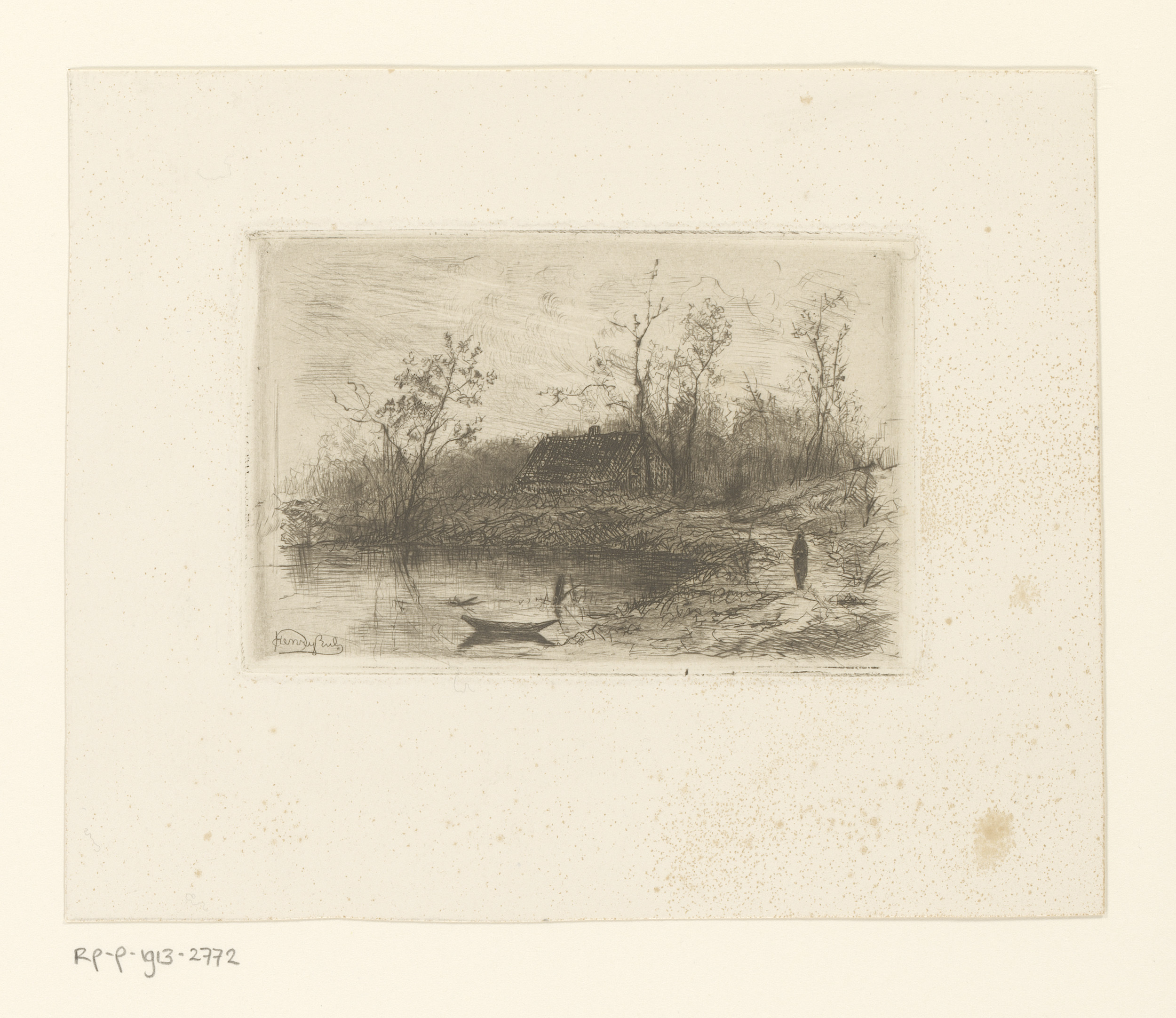 Landschap met huis aan een water met boot