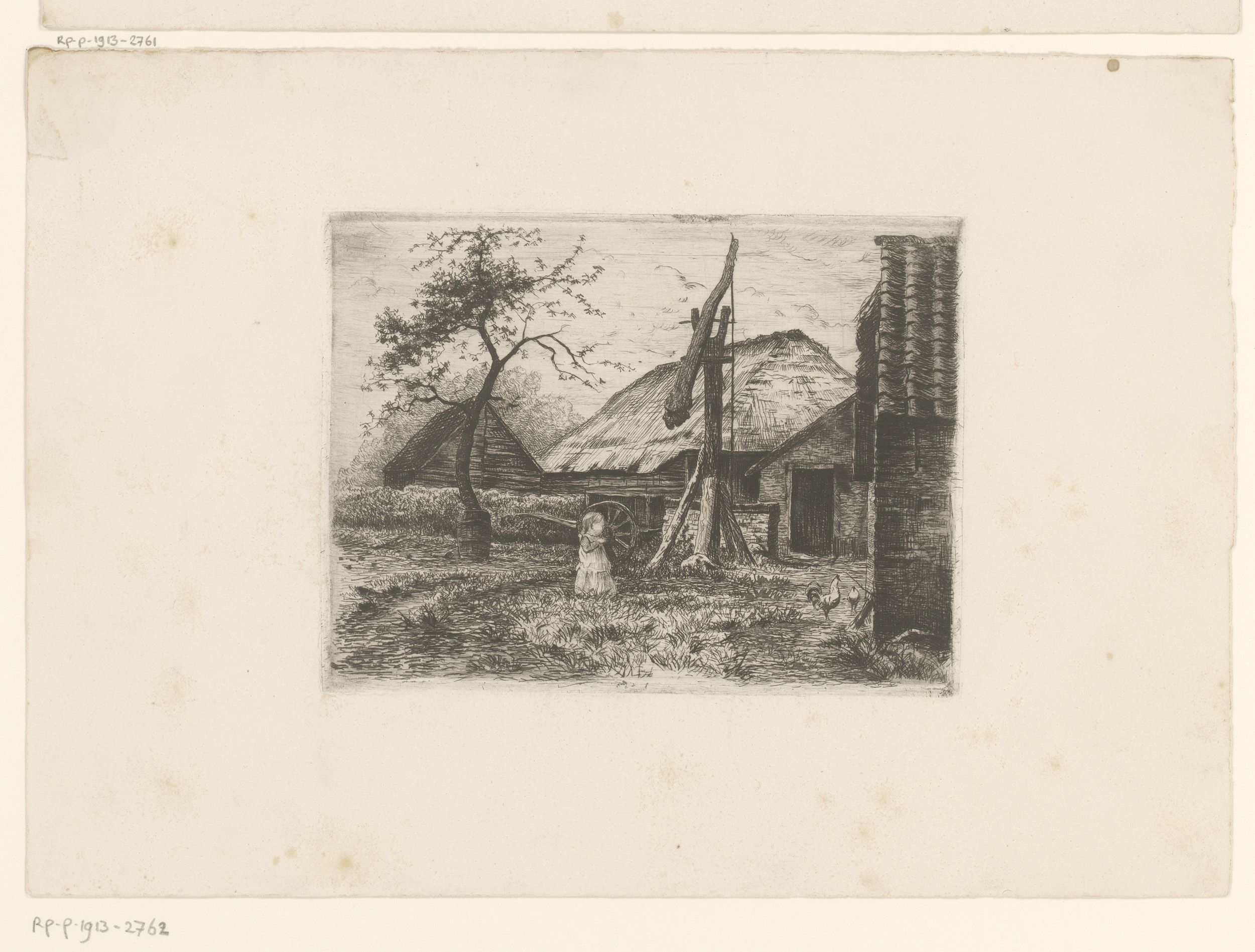 Kind en kippen bij een boerderij met waterput