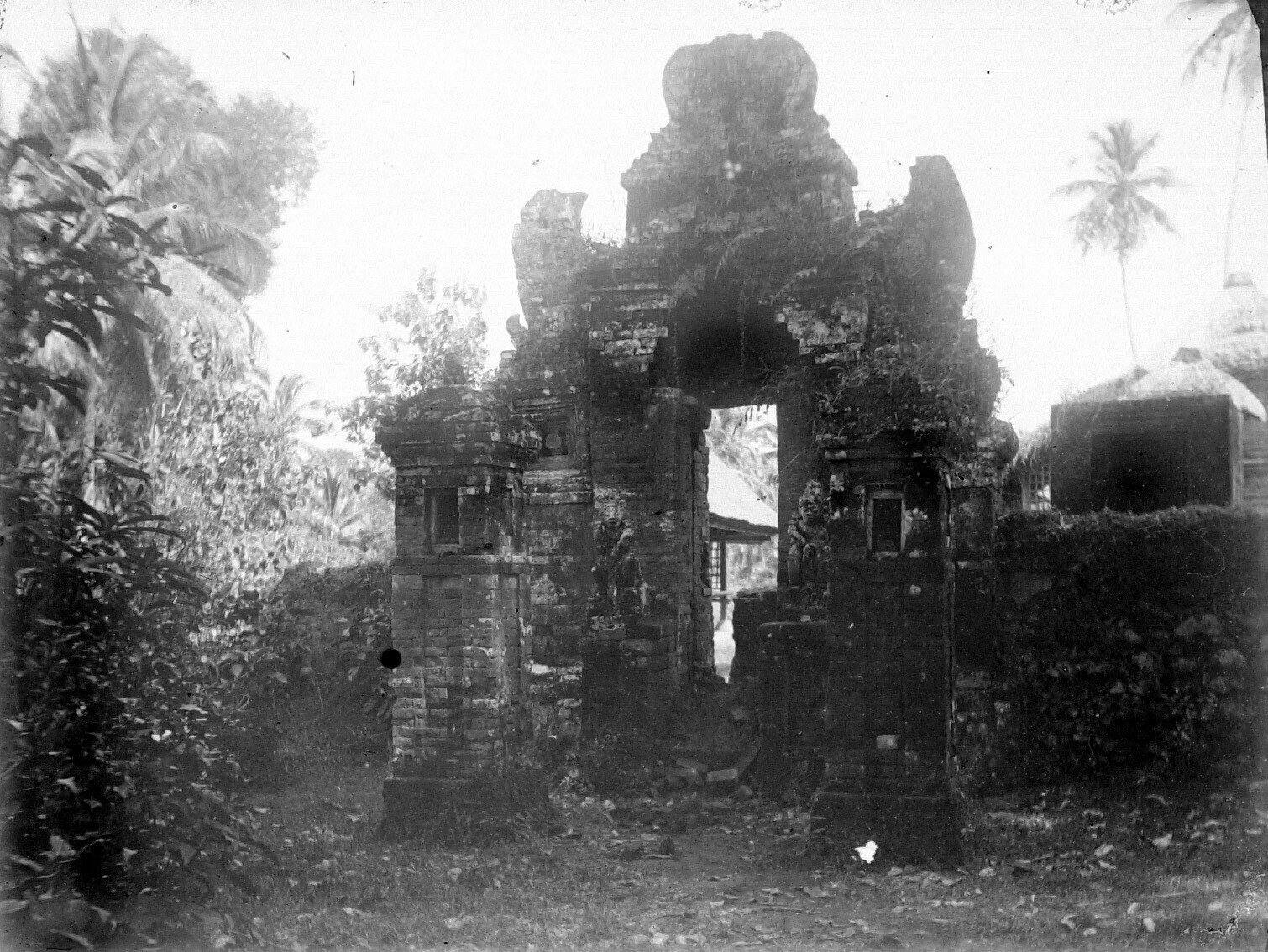 Een door struiken overwoekerde poort van een tempelc...