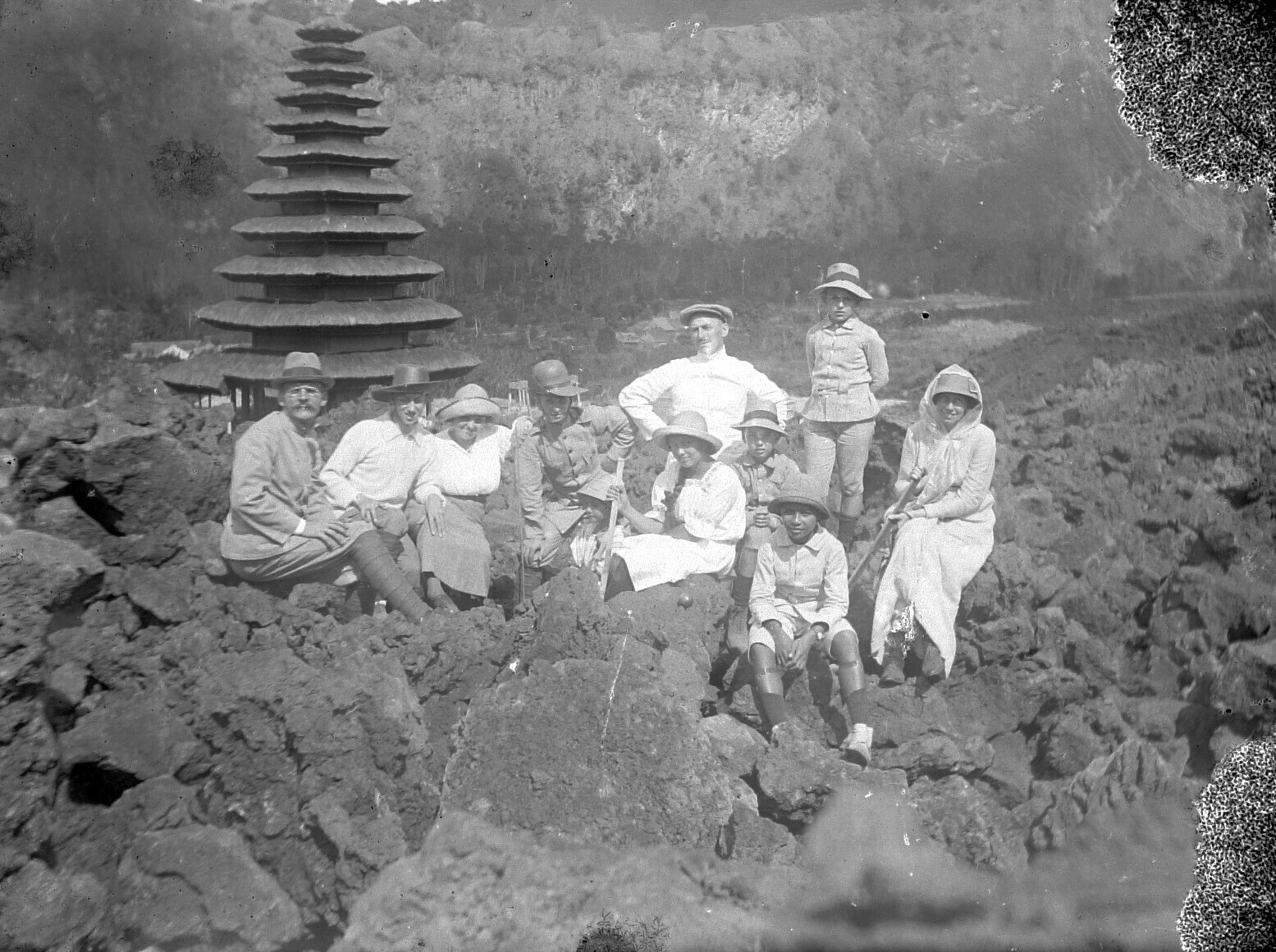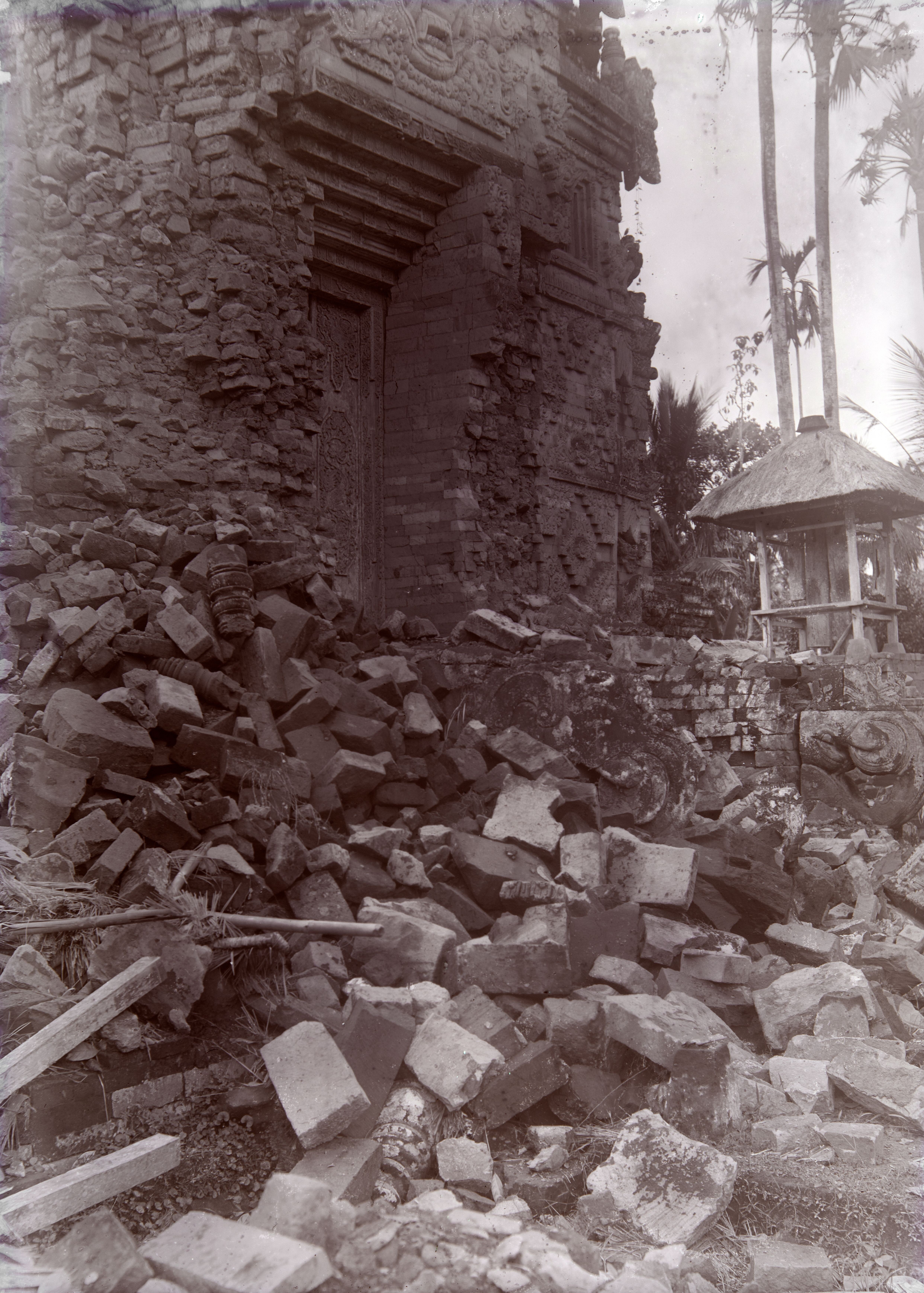 Ingestort bouwwerk na de aardbeving op Bali van 1917