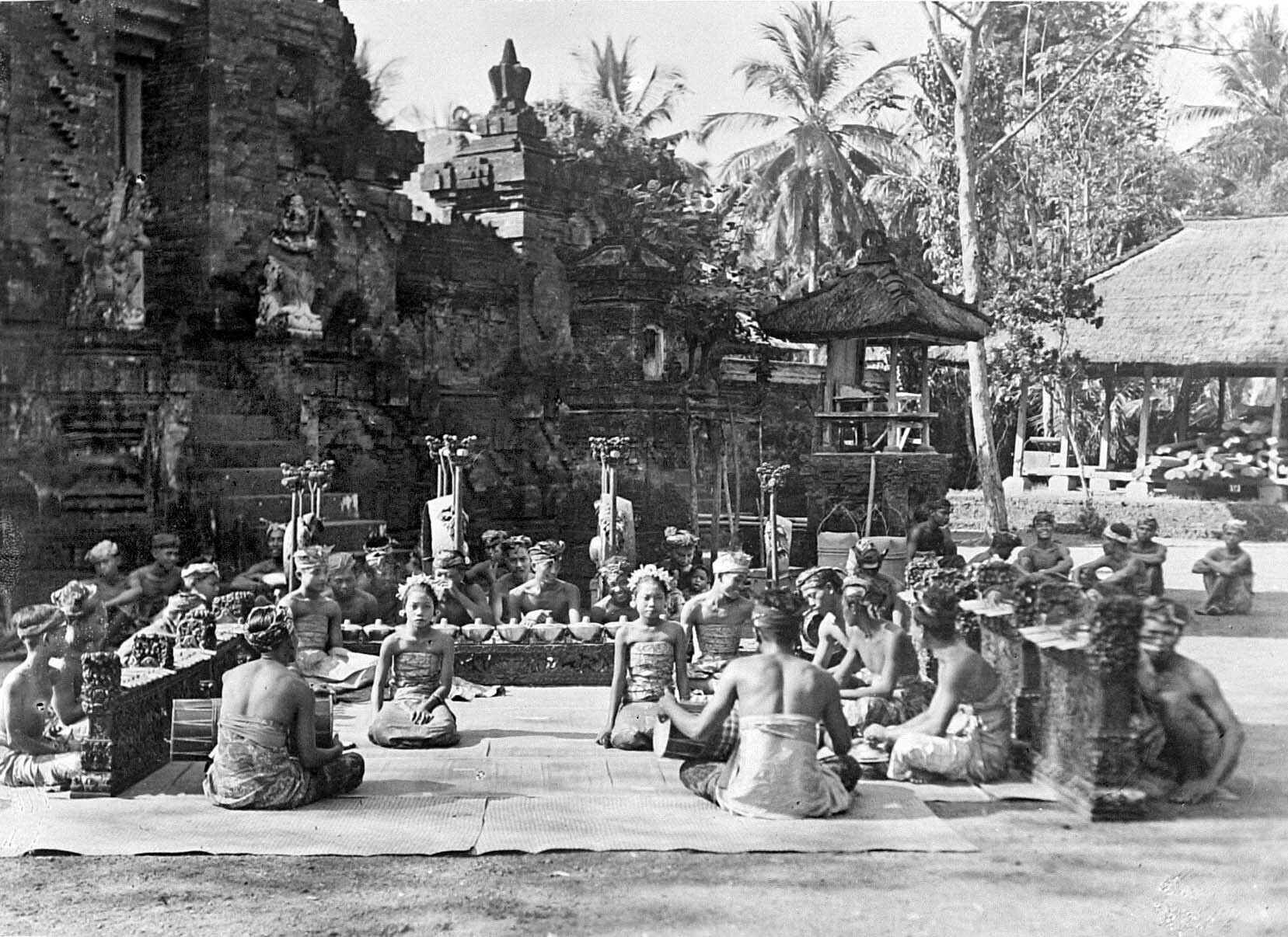 Balinese dansers, danseressen en gamelanspelers in d...