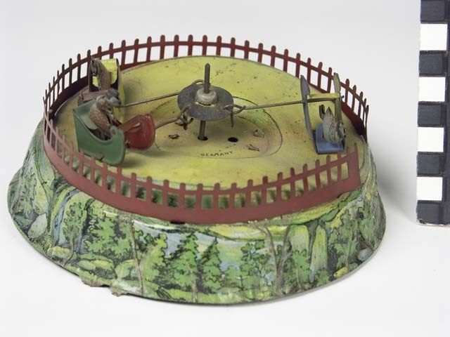Draaimolen met 3 sleeën met 3 meisjes, rondom een hek