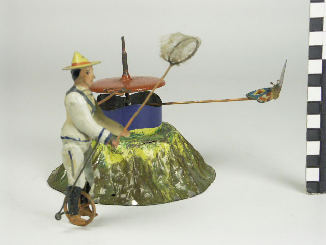 Vlindervanger met vlindernet, loopt achter vlinder aan