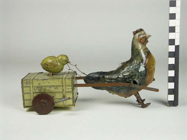 Kip die een kar trekt waarop een kuiken zit dat de t...