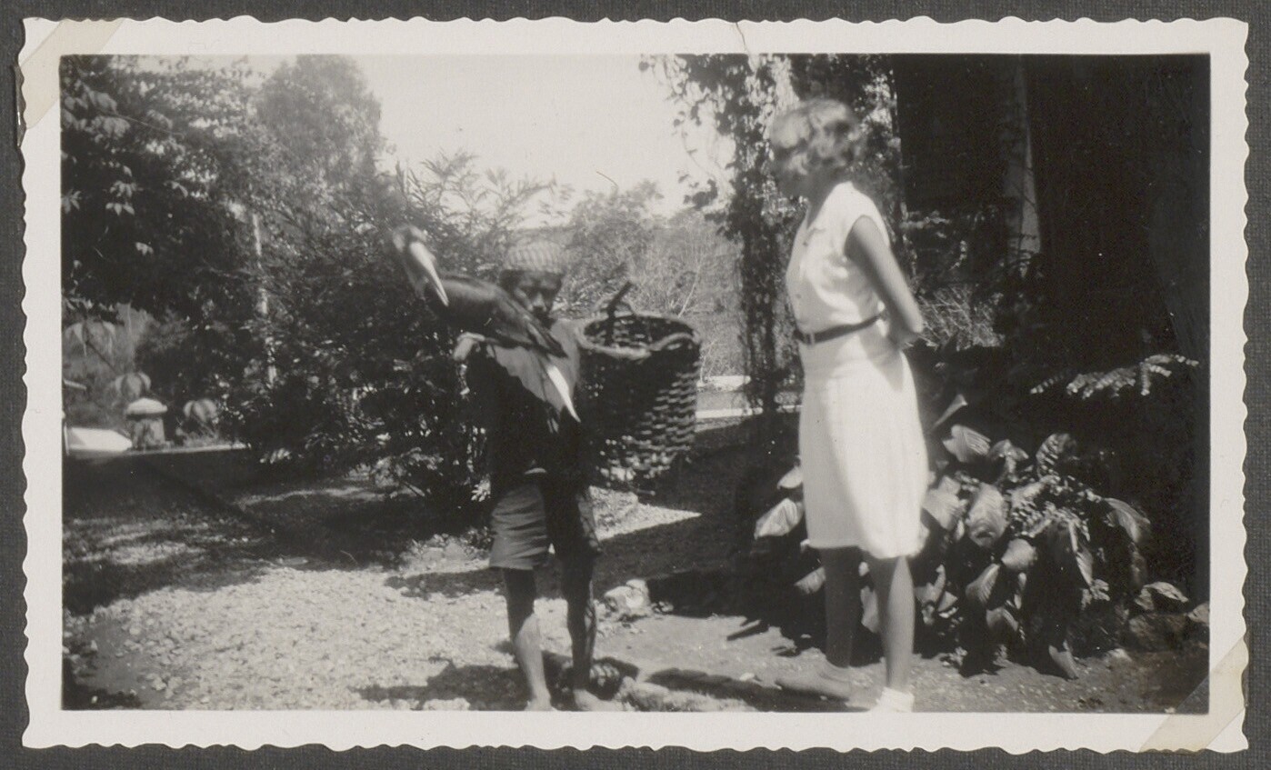 Vrouw met neushoornvogel op de arm