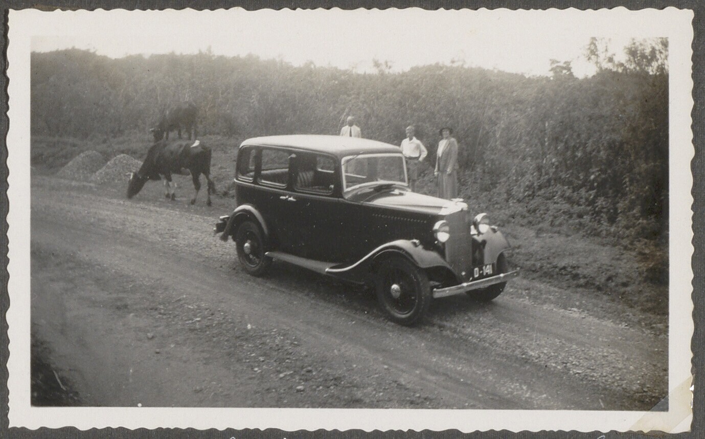 Twee mannen en een vrouw poseren bij auto en koe