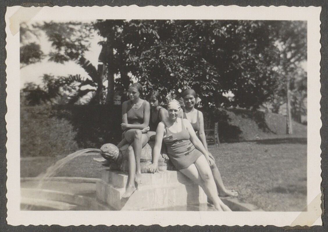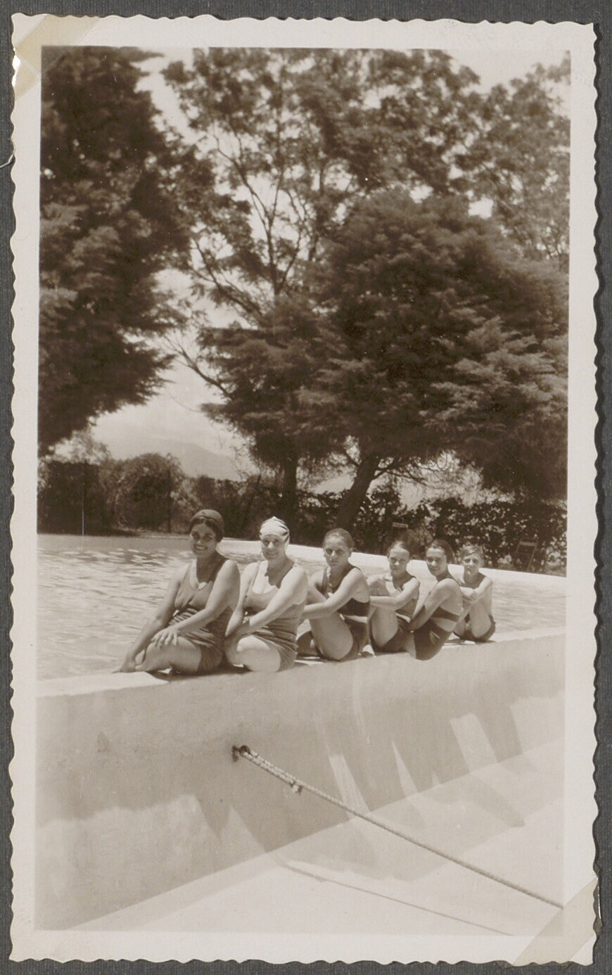 Vier vrouwen aan de rand van het zwembad