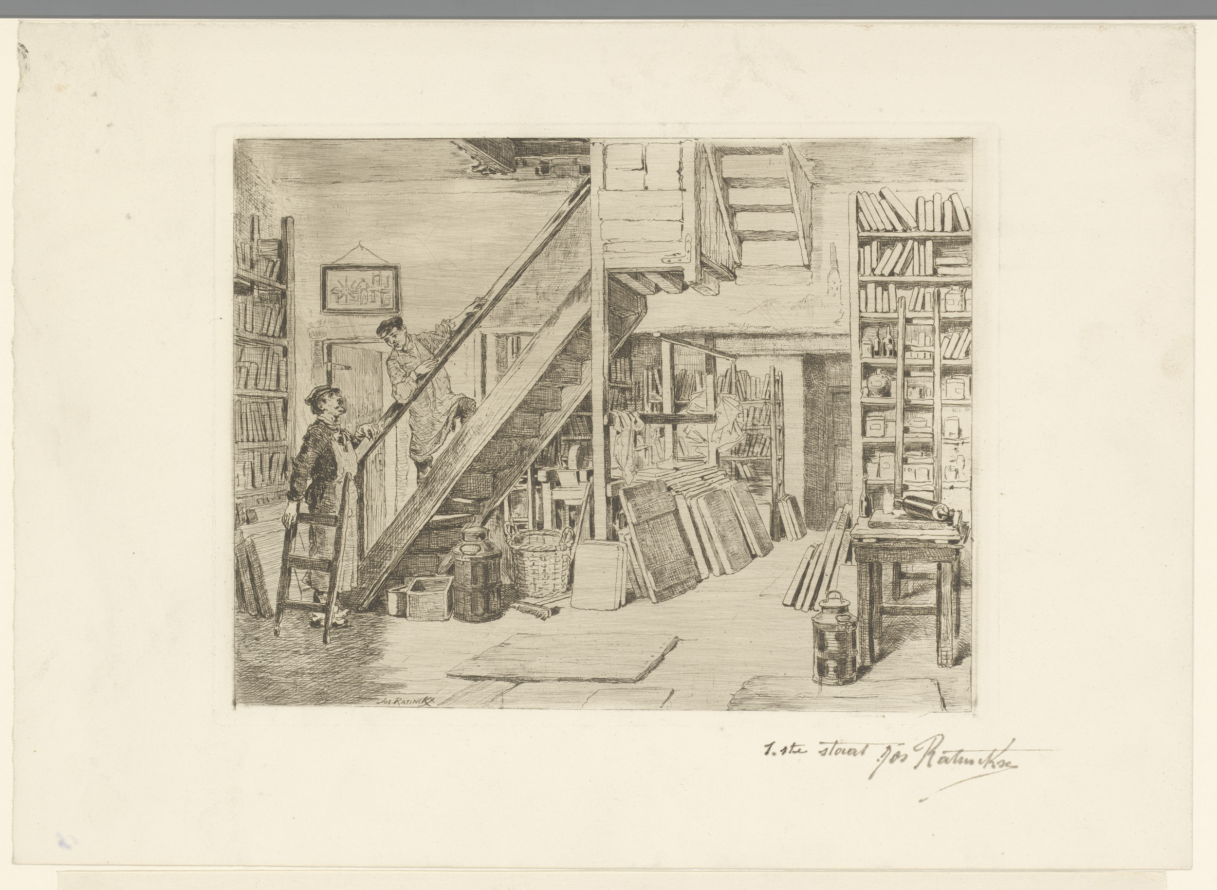 Twee mannen bij een trap in een Antwerpse lithografe...