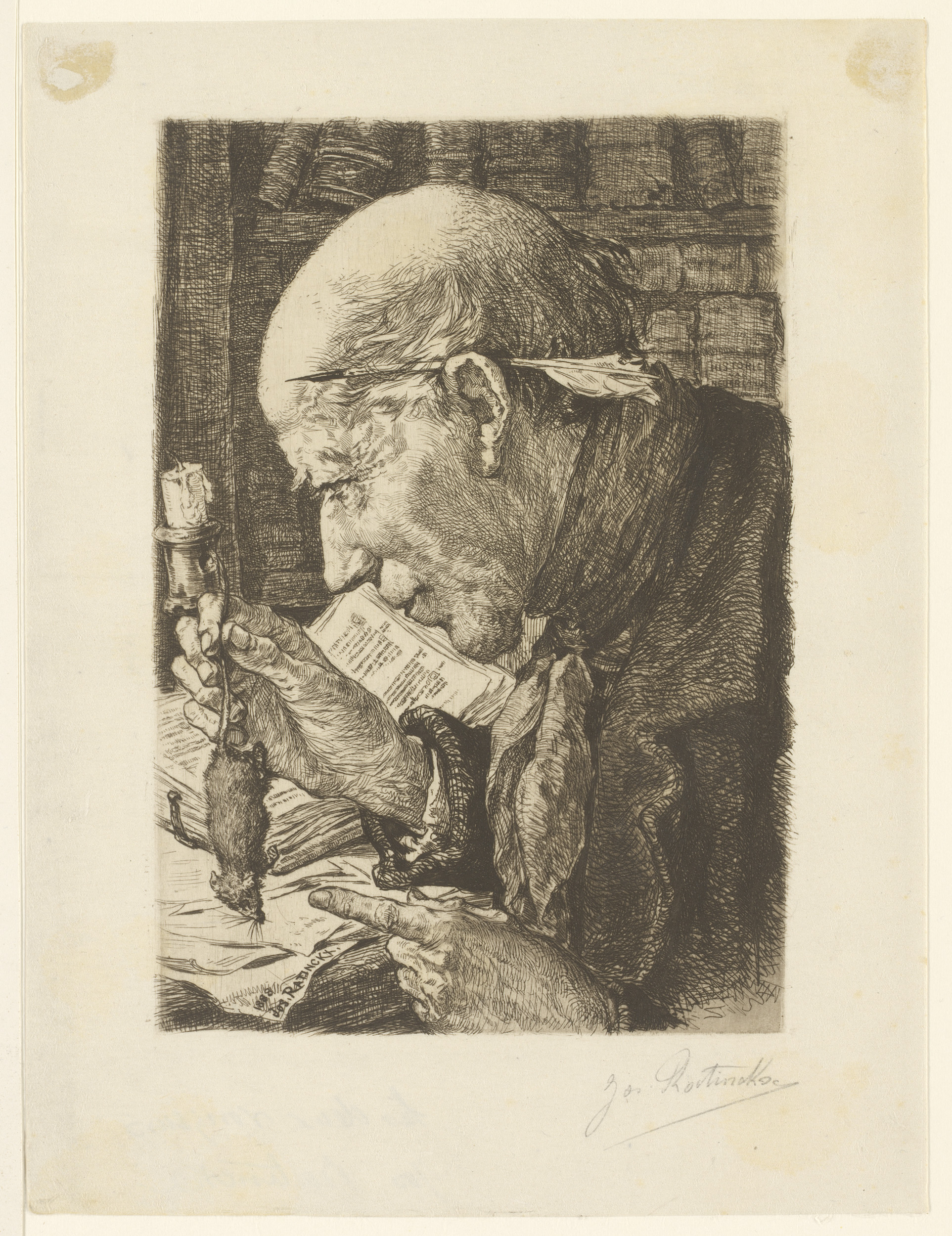 Man gezeten voor een boekenkast met een schrijfveer ...