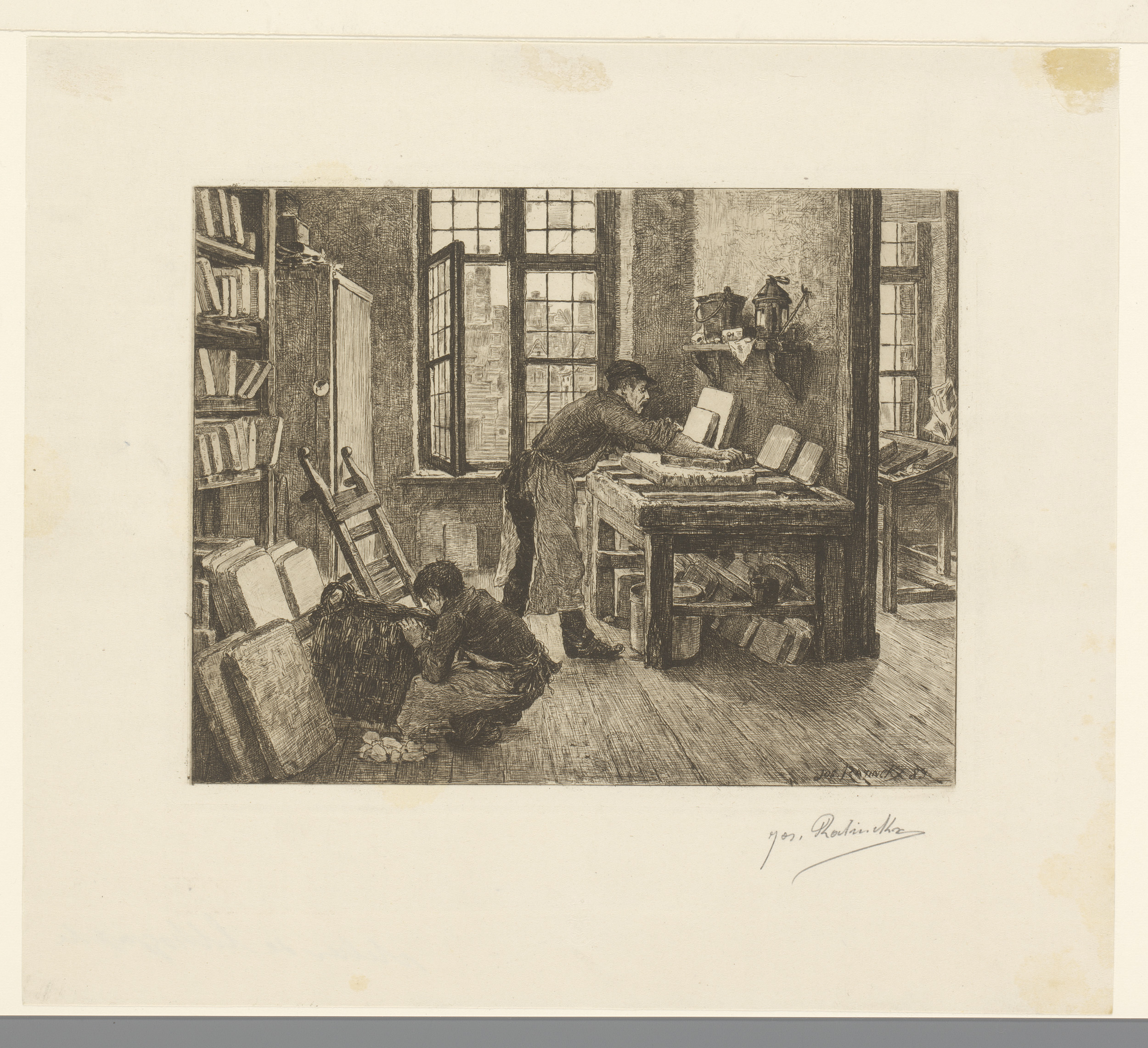 Lithograaf aan het werk in zijn werkplaats