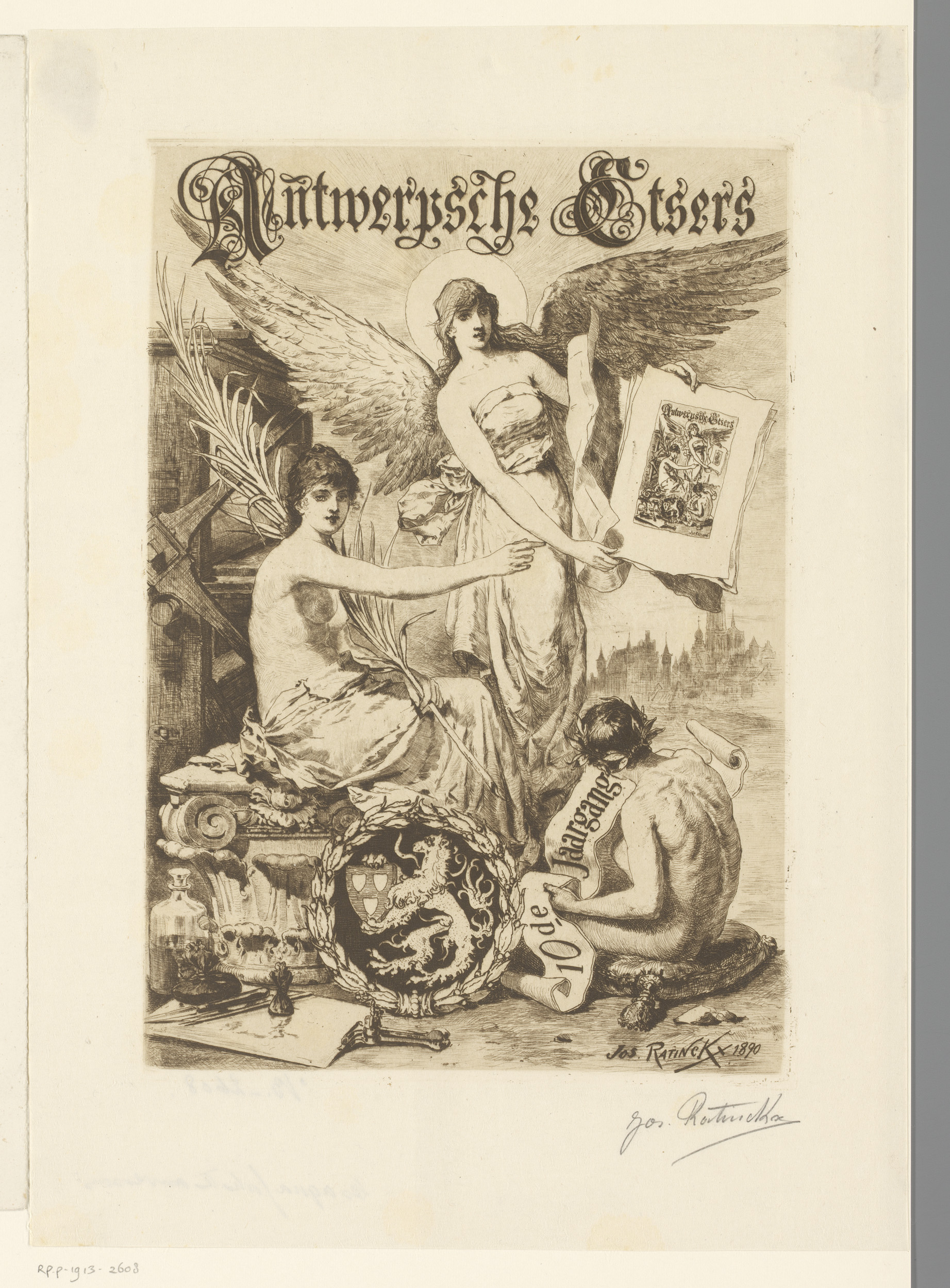 Allegorische figuur met vleugels toont prenten te mi...
