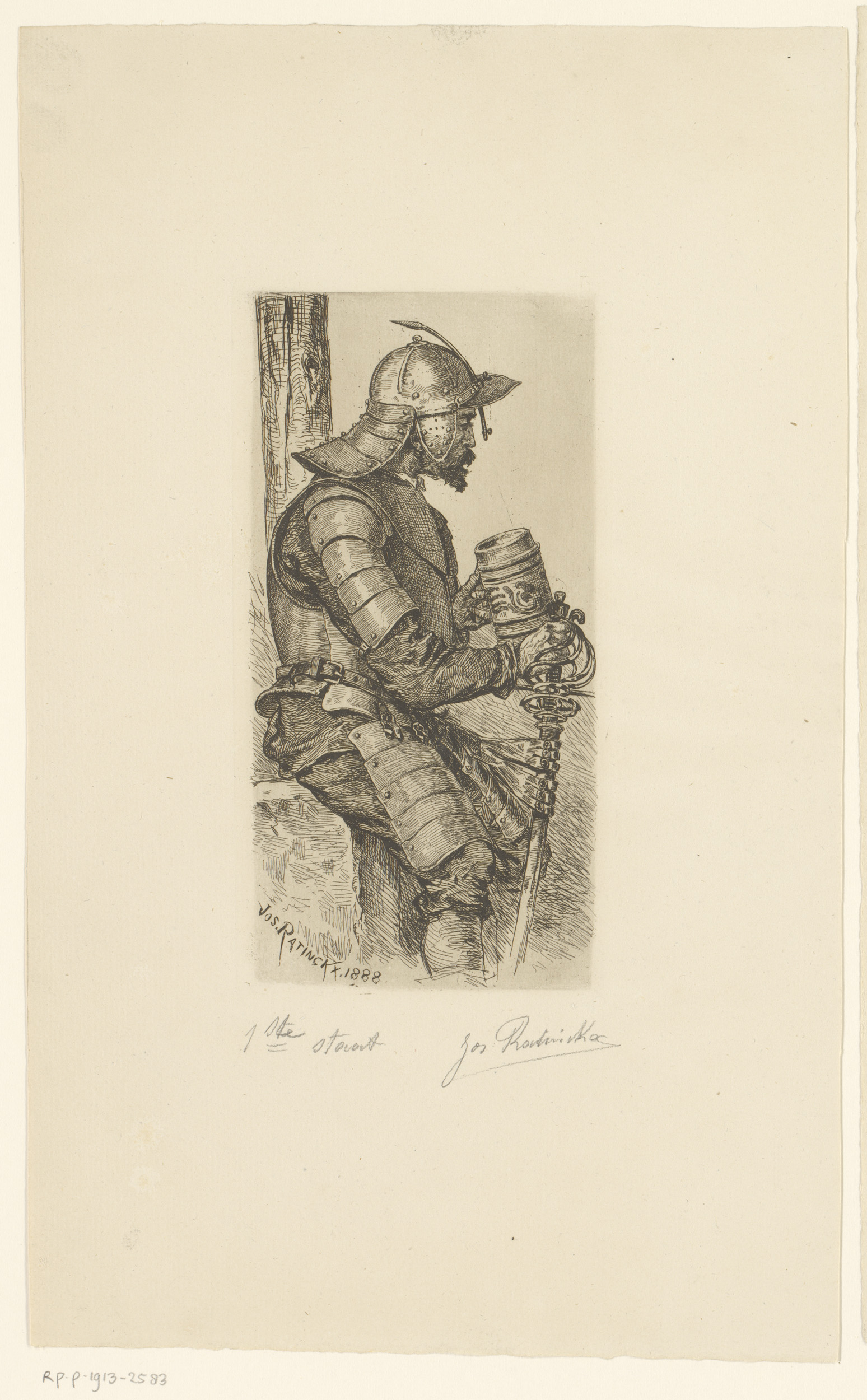 Man in harnas met zwaard en pul