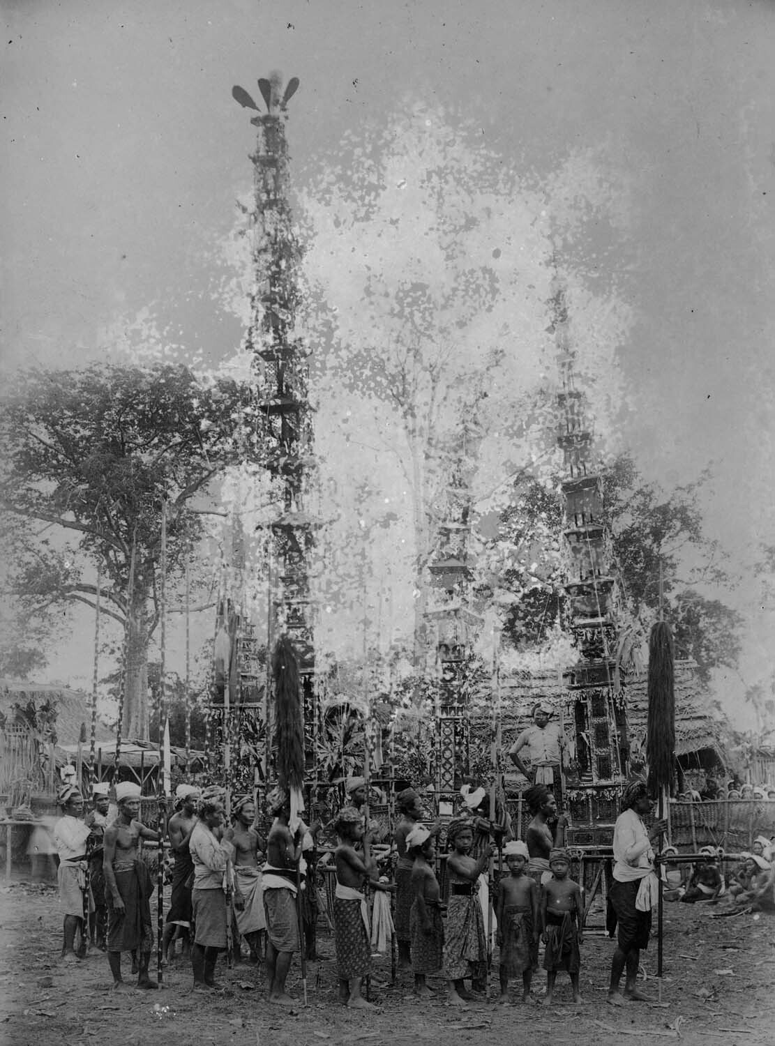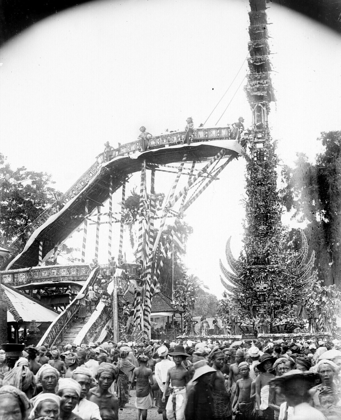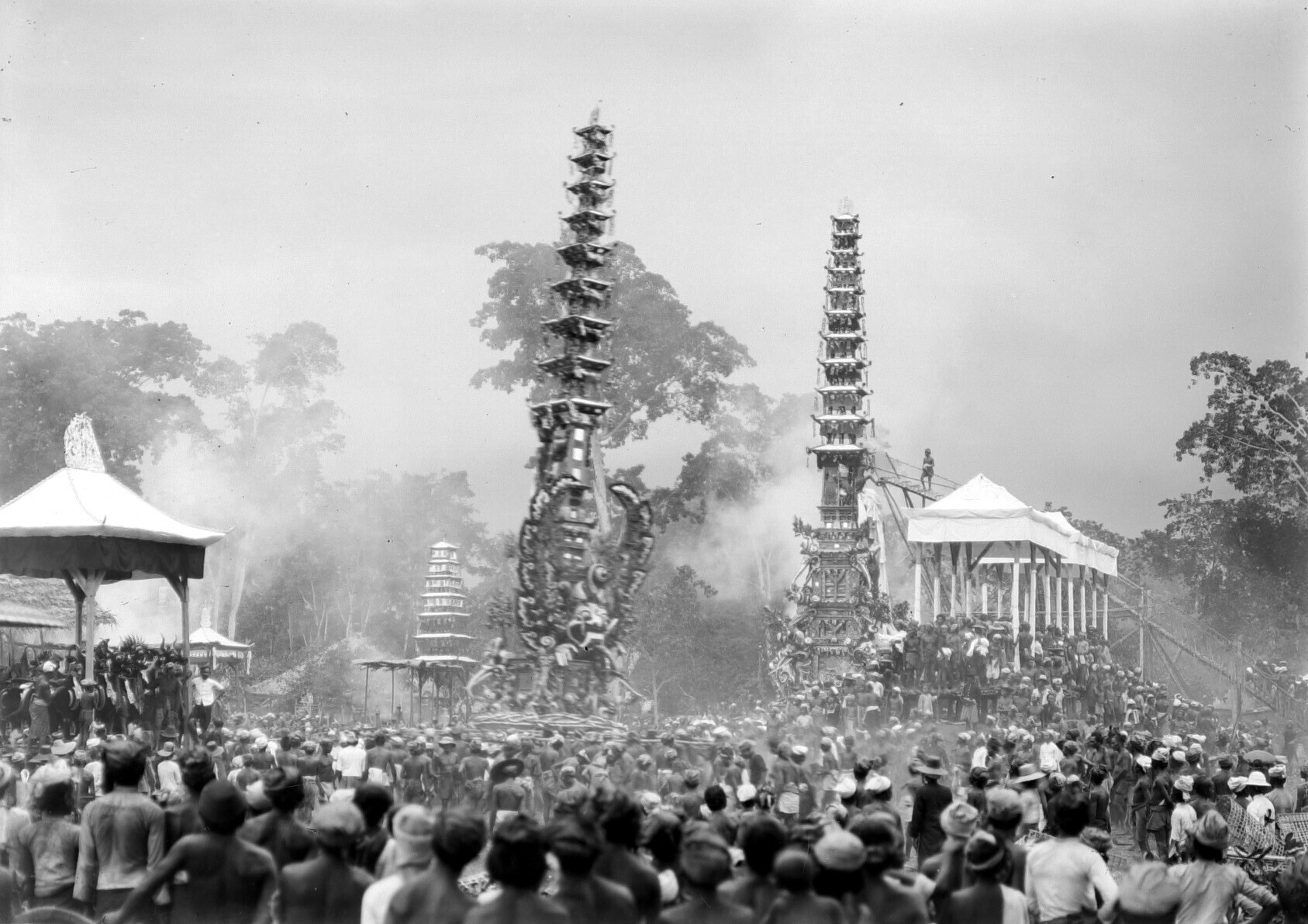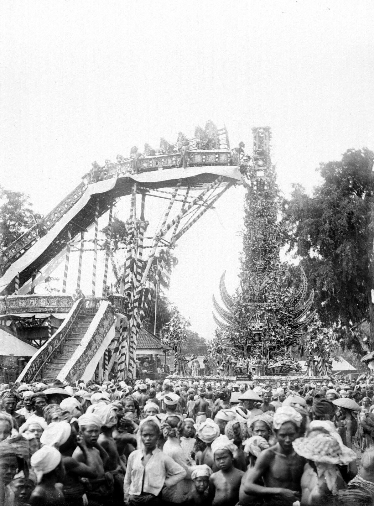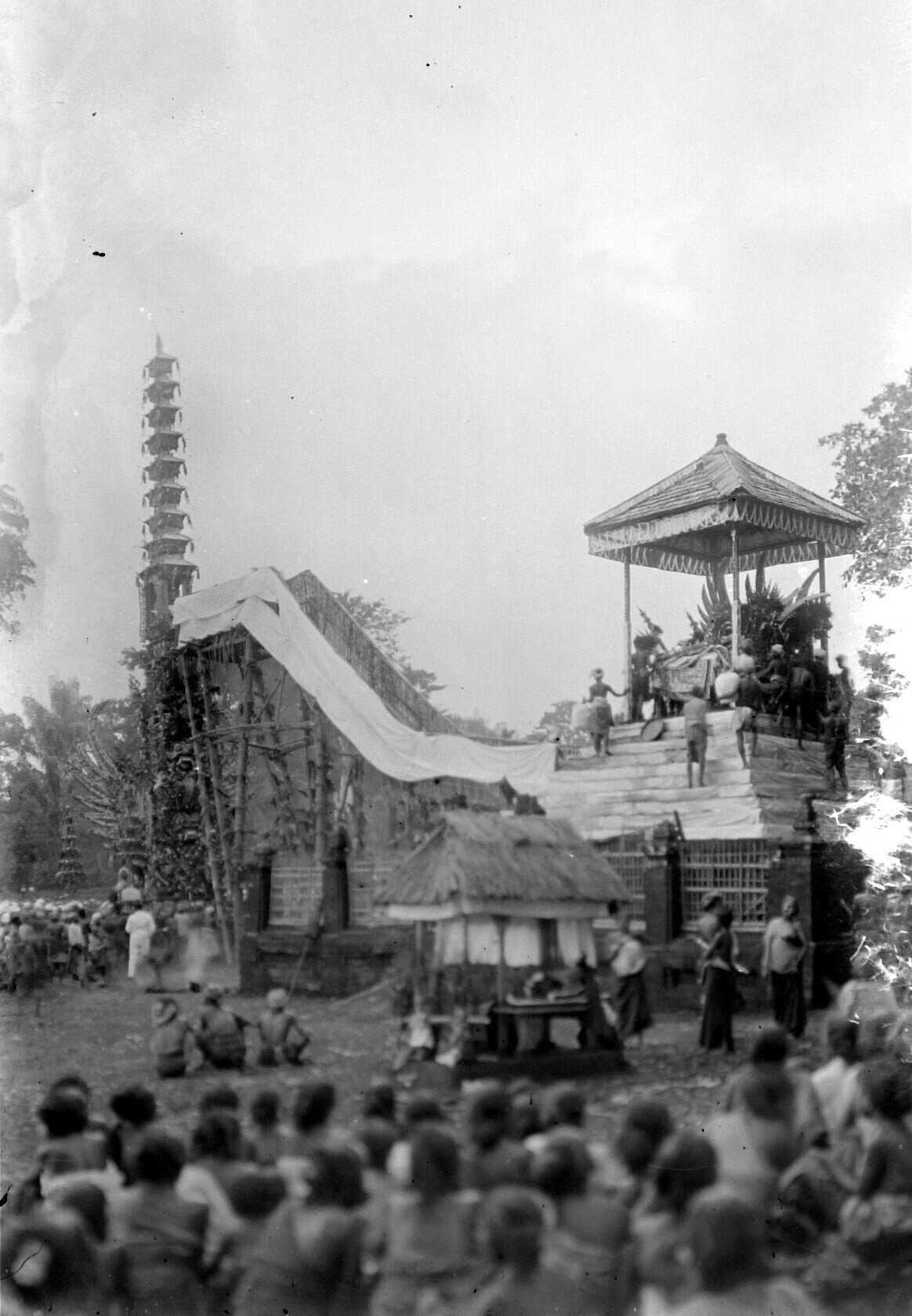 Menigte rondom een lijkentoren tijdens een crematie ...