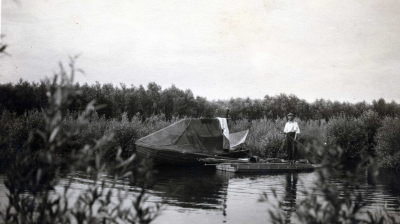 Griendwerker op een bootje in de Biesbosch, begin ja...